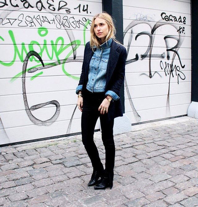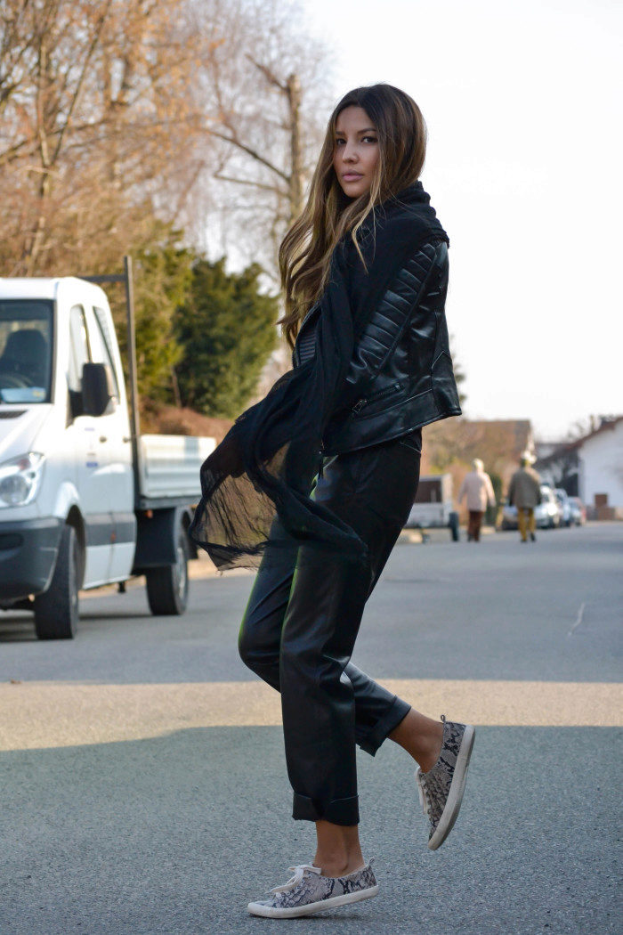 A black jacket and black pants is a standard combination that looks pretty boring, even if it is diluted with a bright shirt or shoes.