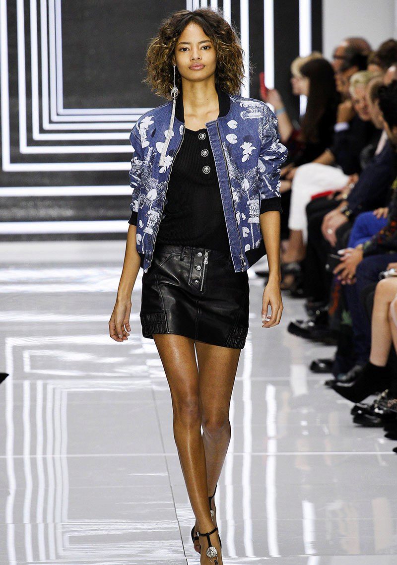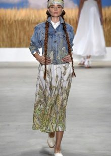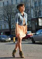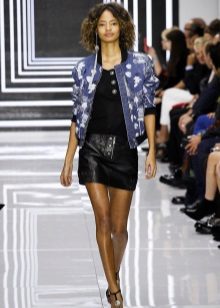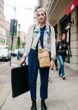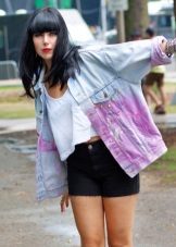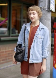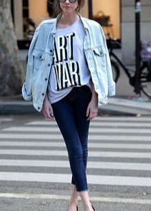 A favorite option is a t-shirt with a pattern, shorts on high posade, an elongated oversized jeans jacket and white sneakers. Hair can be collected in a sloppy bundle.