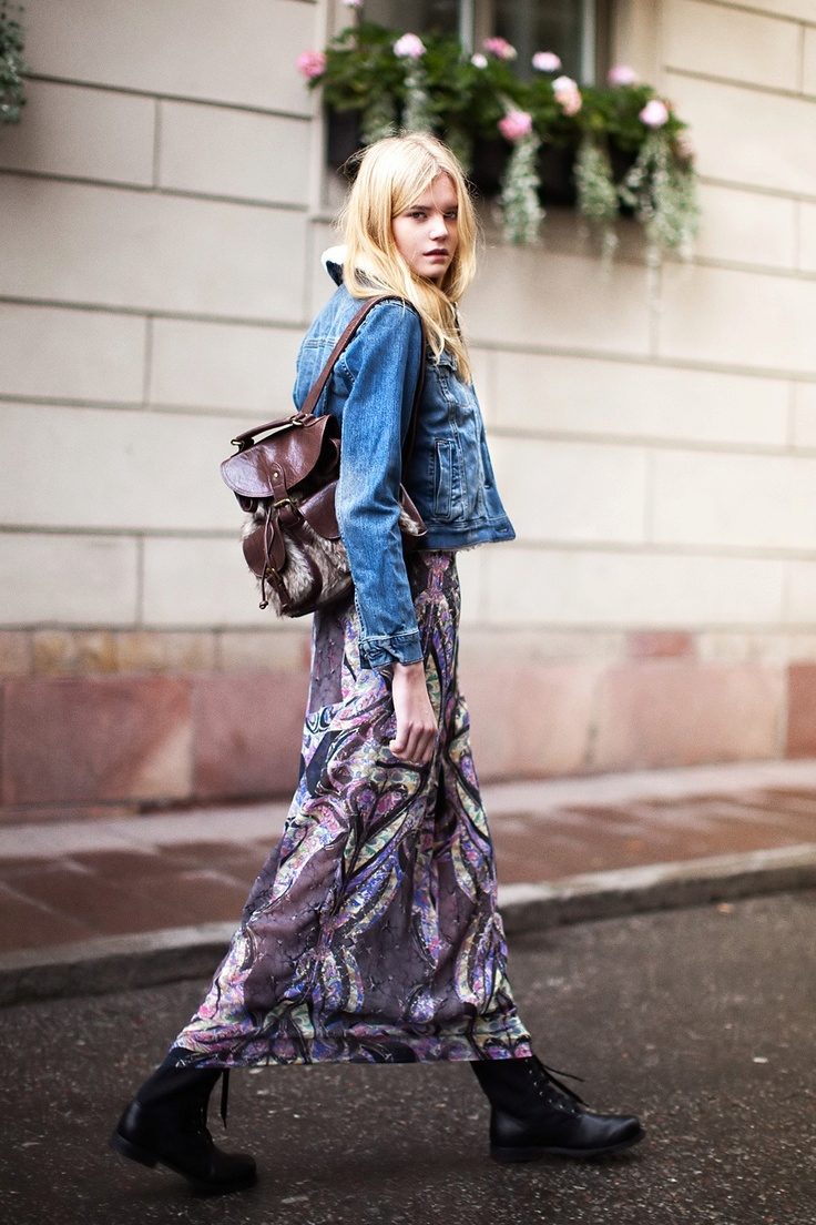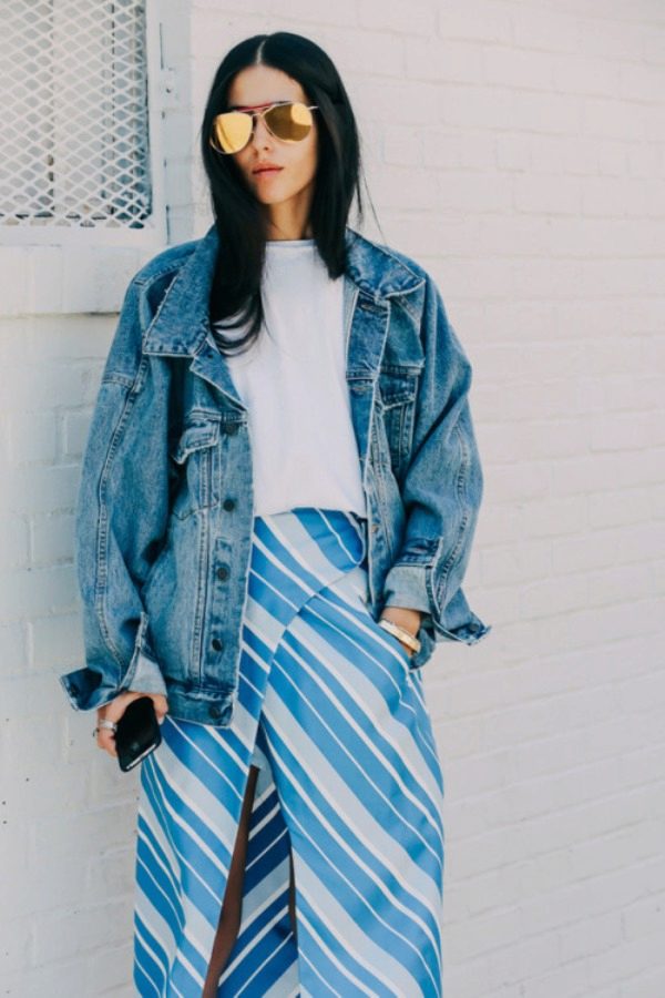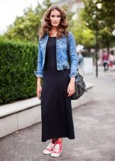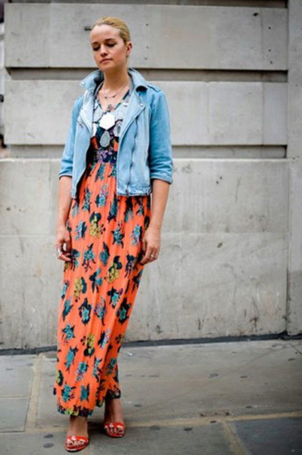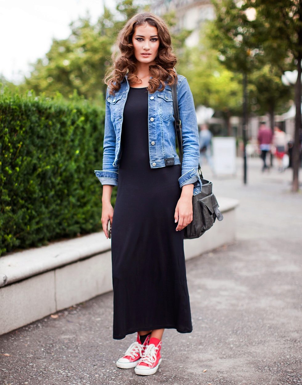 Tip for the look: Take a white oversized denim jacket, put on a black fitted maxi dress with a bright pattern. Bottom pick yourself: fit heels and sports shoes.