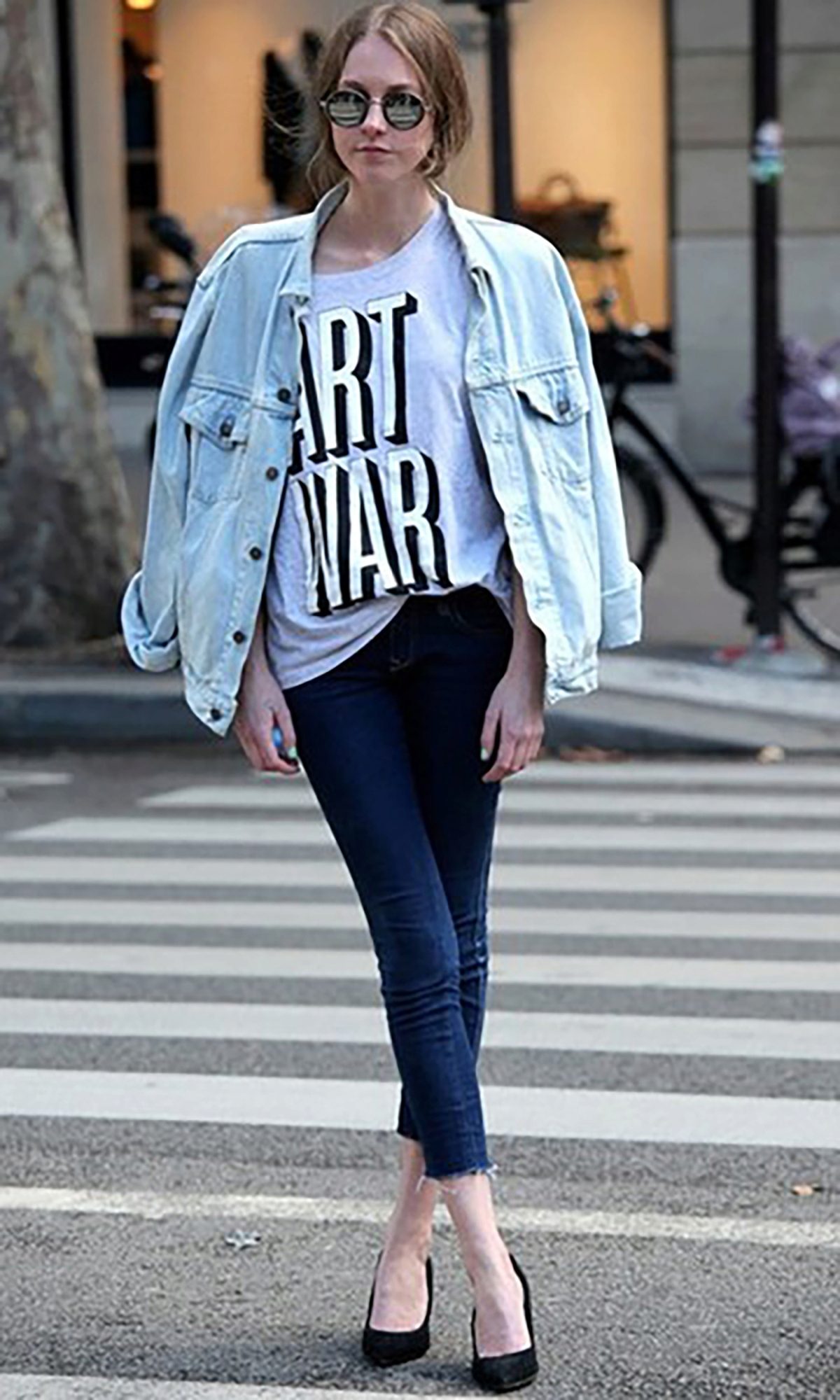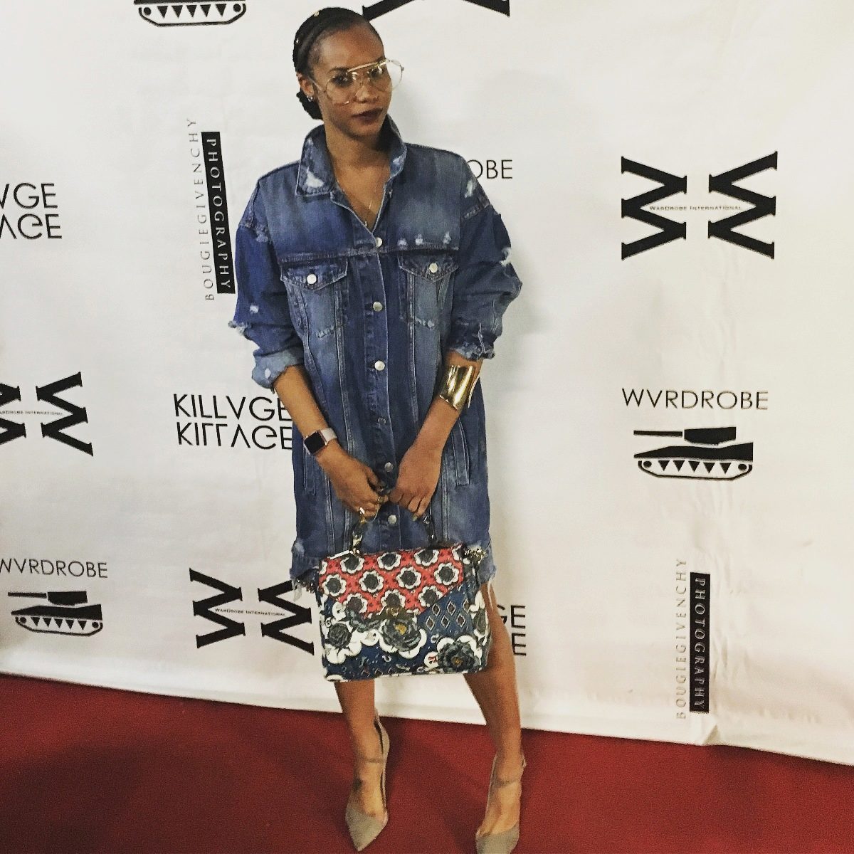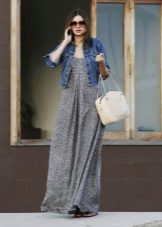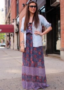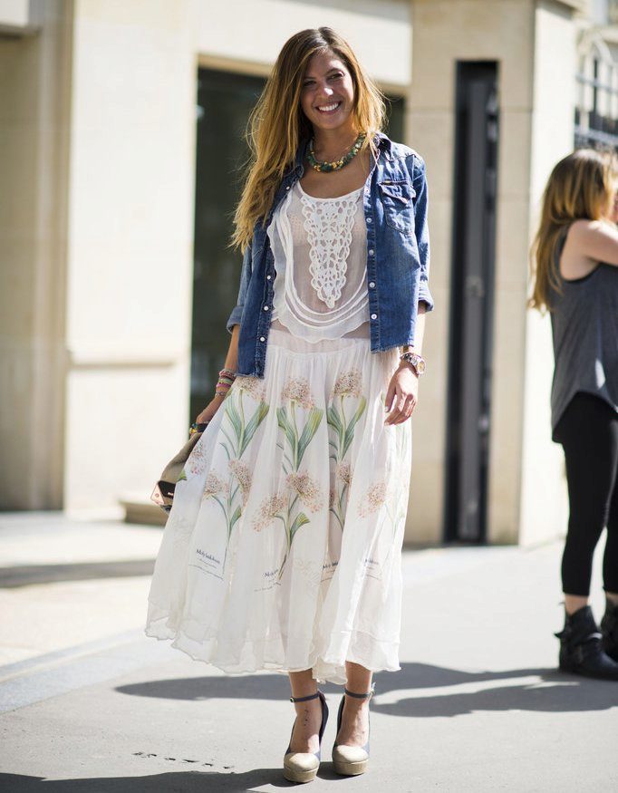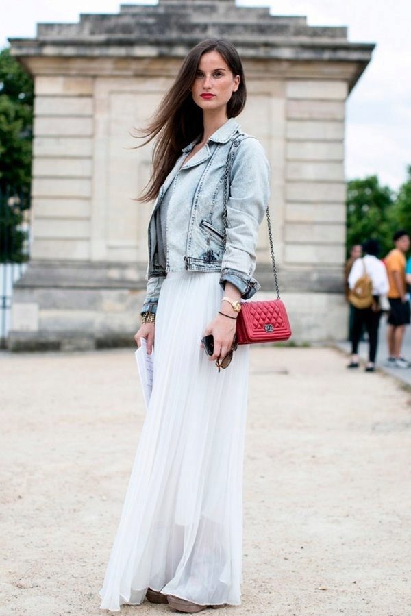 Tip for the look: Take a white oversized denim jacket, put on a black fitted maxi dress with a bright pattern. Bottom pick yourself: fit heels and sports shoes.