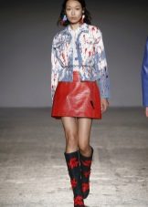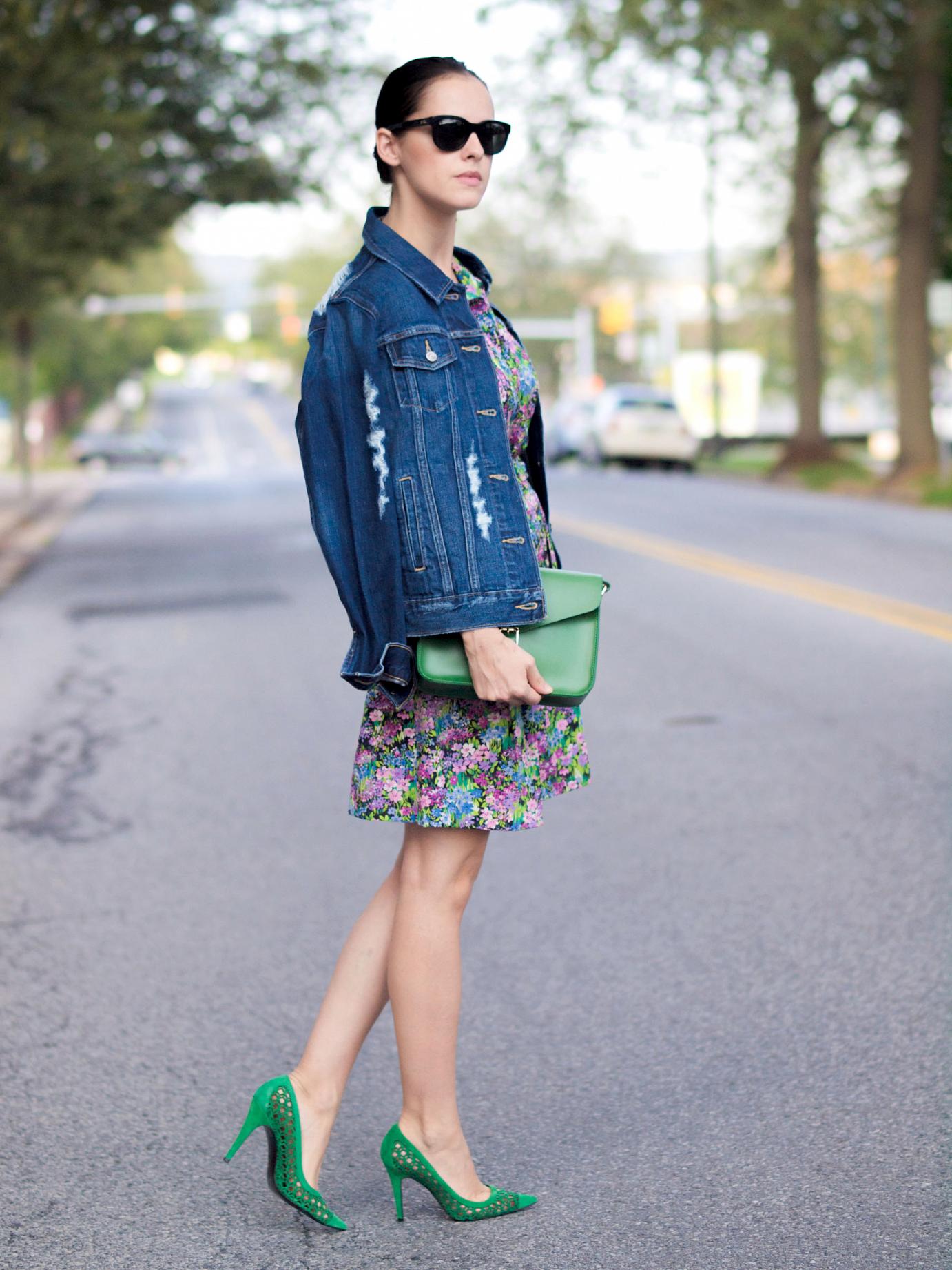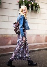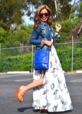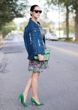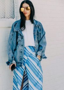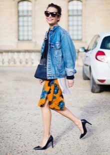 - Bright oversight. Dilute the baggy oversized denim jacket, bright floral pencil skirt. Wear a white shirt and a knitted sweater under your jacket. Pick up a strict bag and pumps on heels. Now your silhouette is stunning.