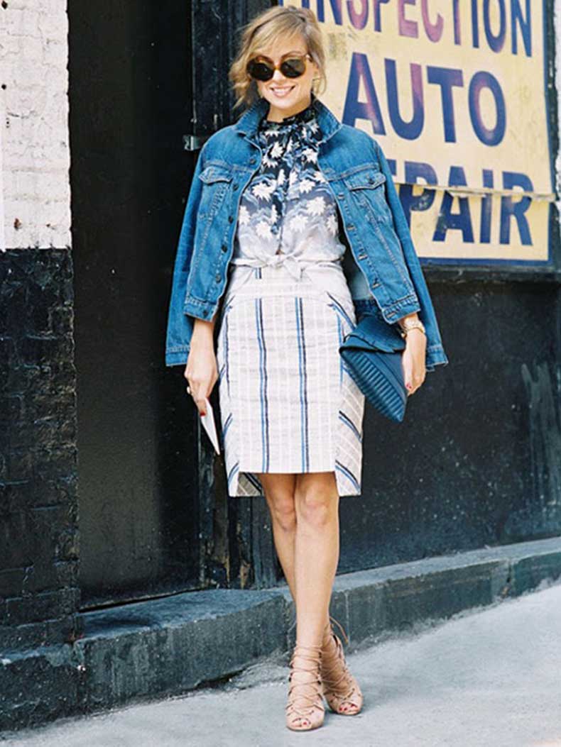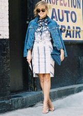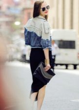 It is worth remembering that denim still refers to a more casual, free style. You will not appear in a denim skirt at an official meeting or at a secular reception. But there is a great solution for those who do not want to part with their favorite material - a denim jacket. Properly composed ensemble of things and accessories in a compartment with a denim jacket, and a new bow for work is ready.