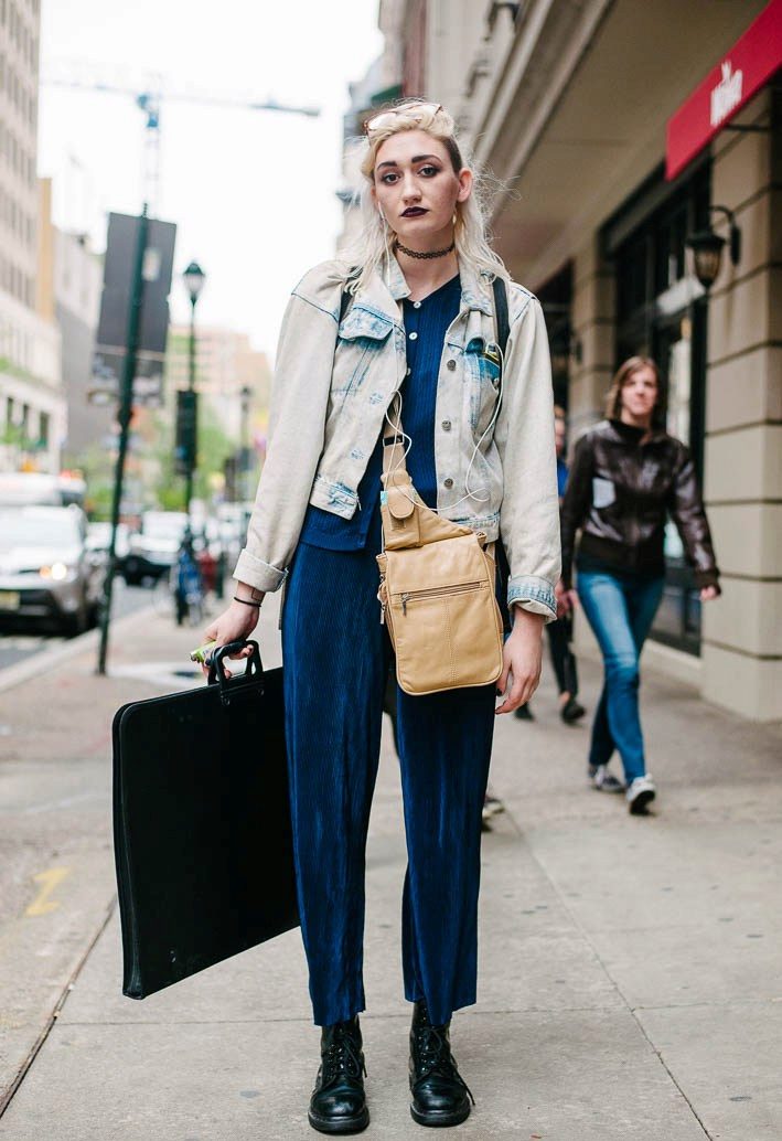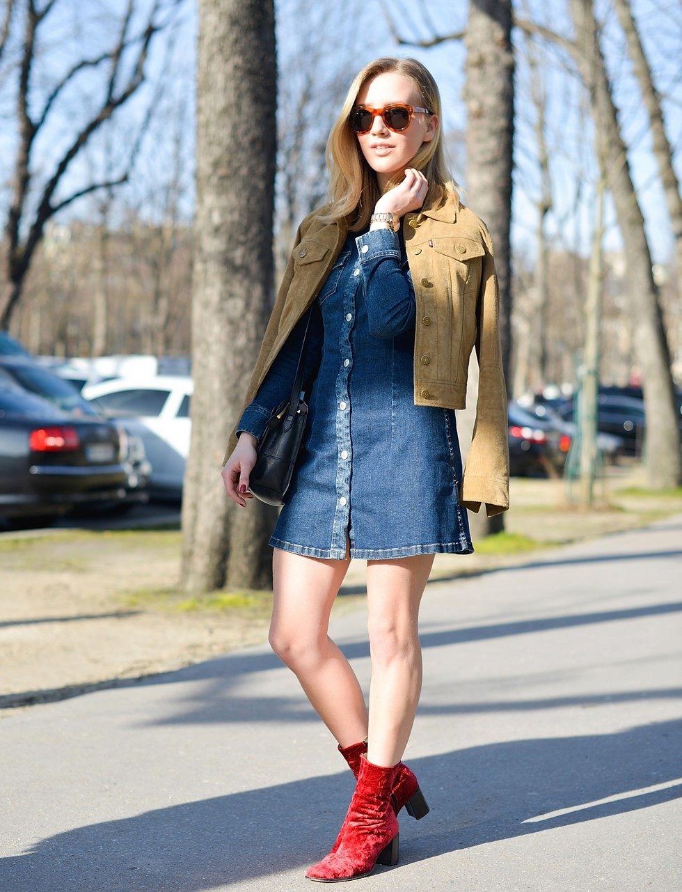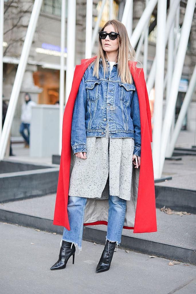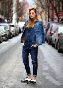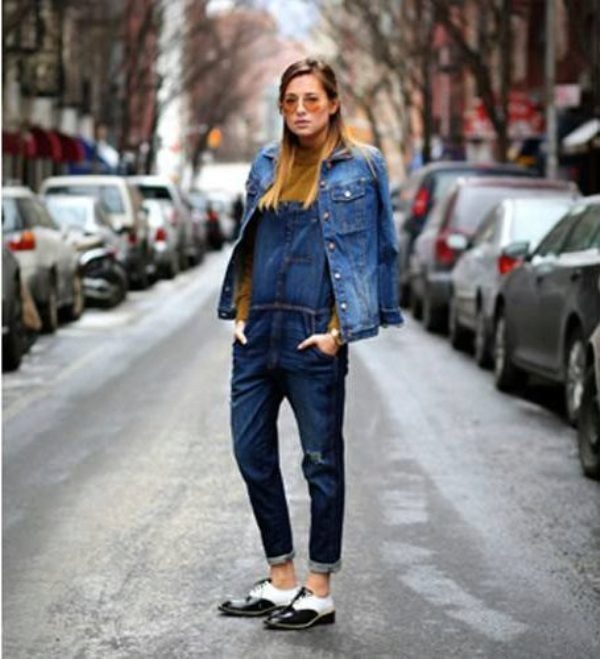 - Denim on denim. More recently, this combination was a crime in the fashion world. Now is a new stylish solution. Wear a denim jacket over a striped sweater and oversized denim jumpsuit. Oxfords shoes are perfect for your feet. Hair loose or make braids. It all depends on the mood.