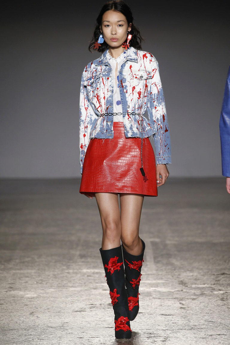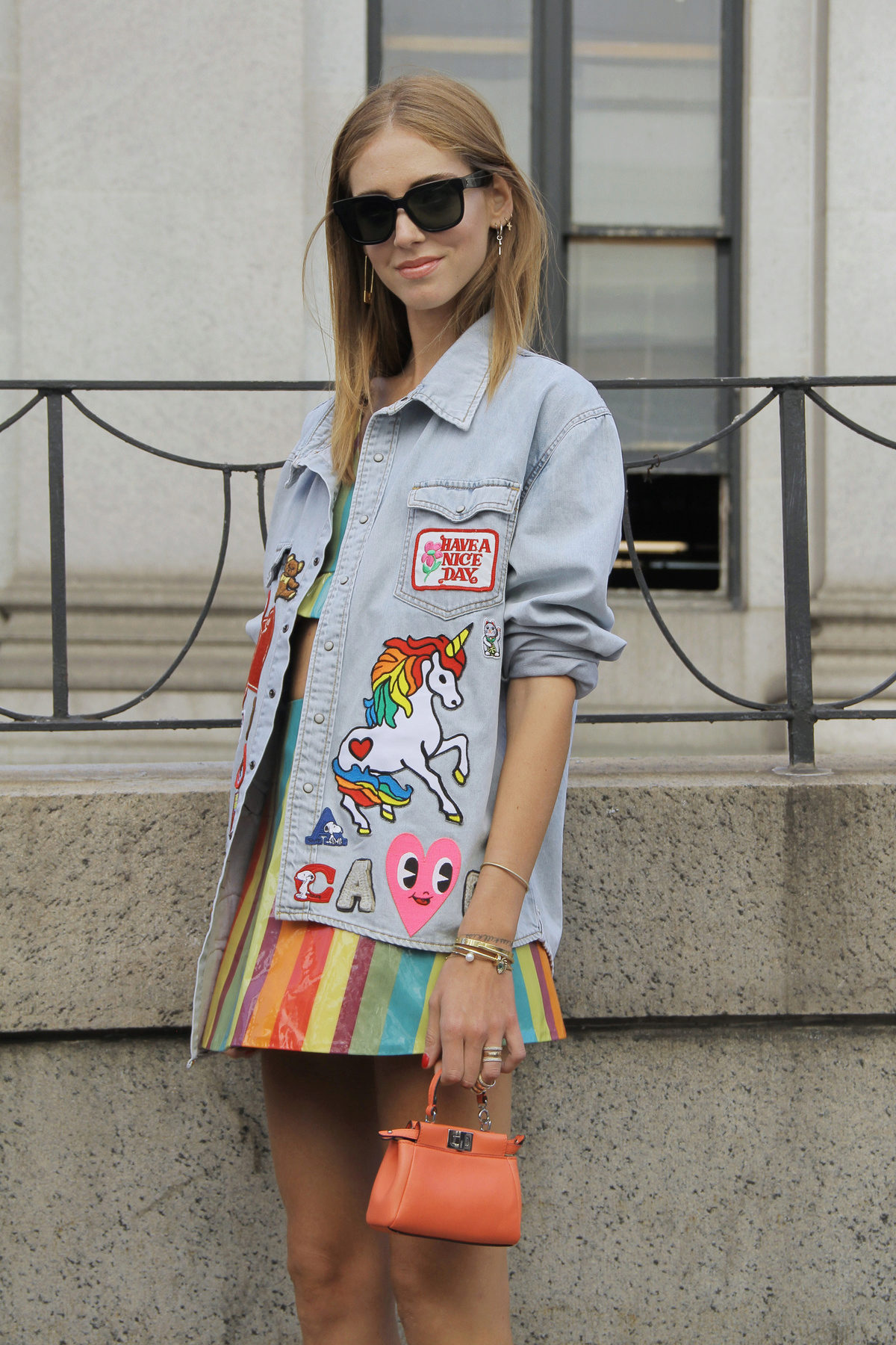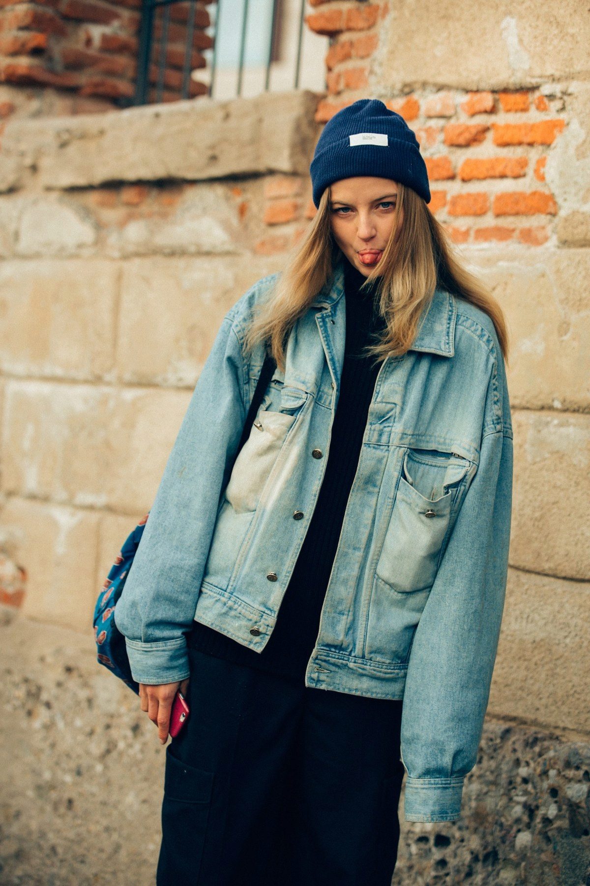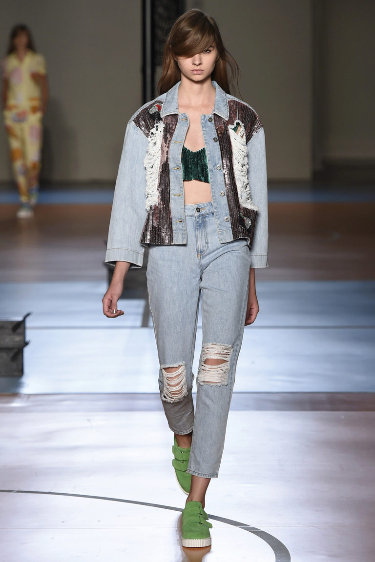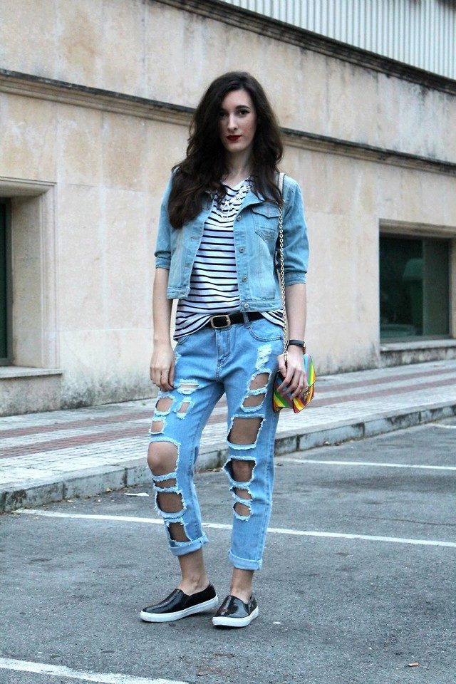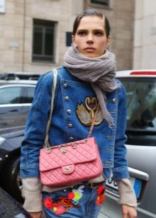 Tip for the look: a blue denim jacket, dotted with holes and threads, put on a short top of a bright pink top, add a bow with jeans with high waist and holes on the knees, and “conversions” in your favorite colors on the legs.