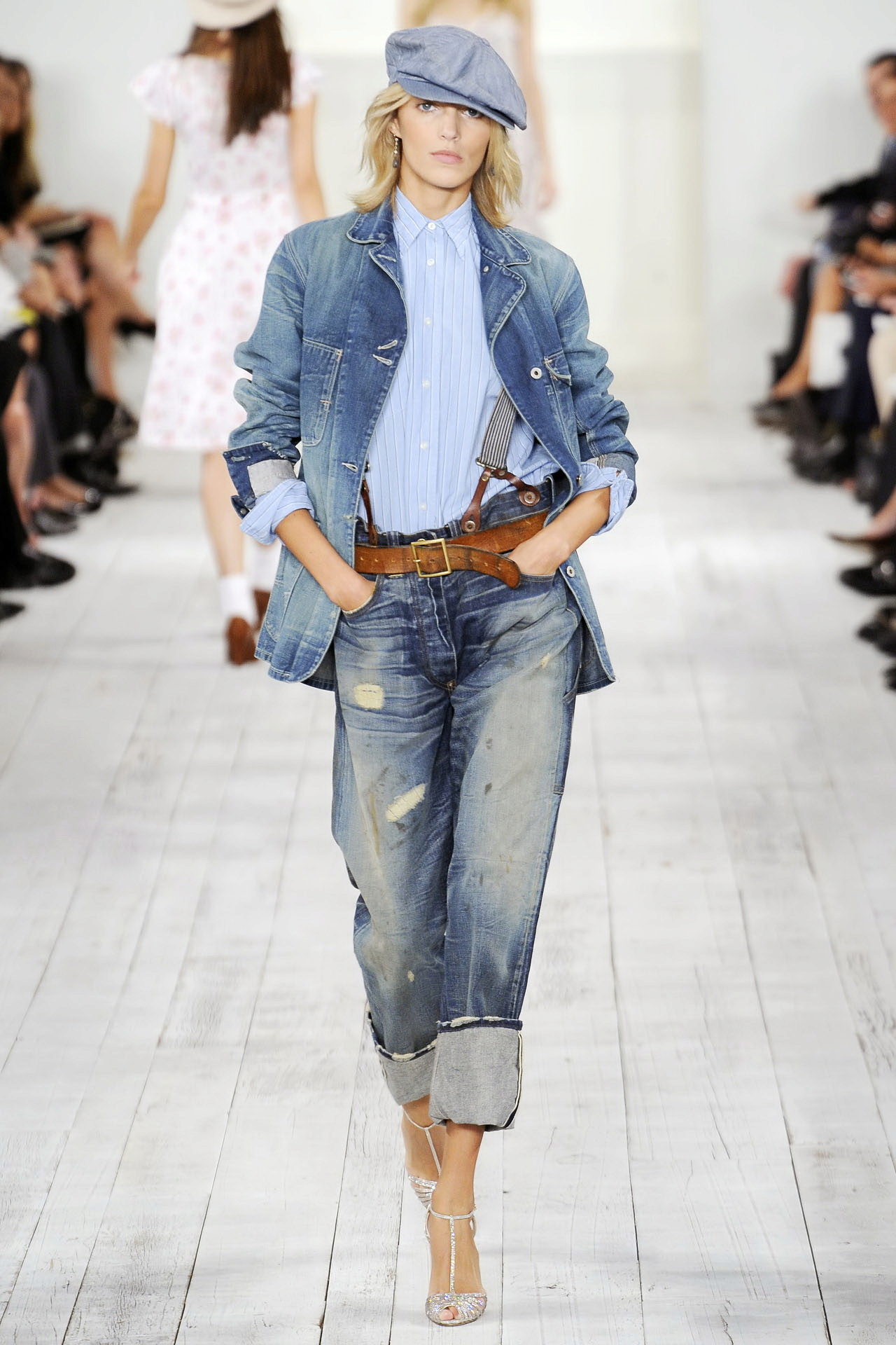 Blue cropped sleeveless jacket, sky-blue chiffon dress to the floor, woven sandals with thin soles, soft curls framing the face. What could be better?