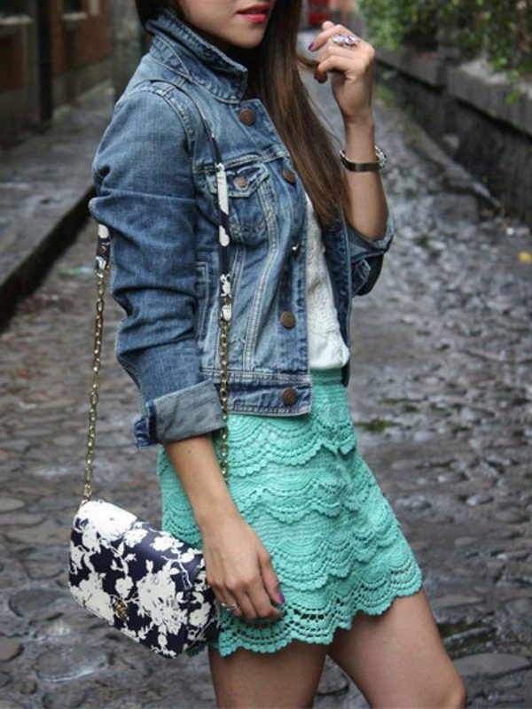 - Lace and denim. Summer in the yard, I want everything bright and unusual, delicate and stylish, sweet and bold at the same time! You can create a matching look with a cropped 3/4 sleeved jacket, a white slim sleeveless shirt, and a short mint-colored lace skirt. Fill the bow with ballet flats and a handbag on a chain with a cute pattern.