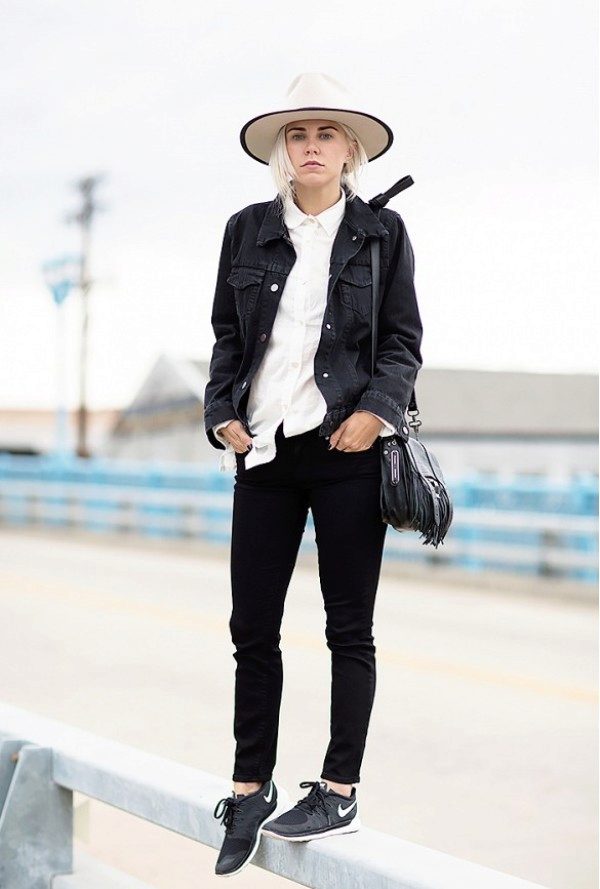 A less loaded version: a black denim jacket without sleeves, a white T-shirt, an alcoholic with a low neckline, denim shorts, black boots with heels, massive accessories, a black hat with wide brim and dark lips.