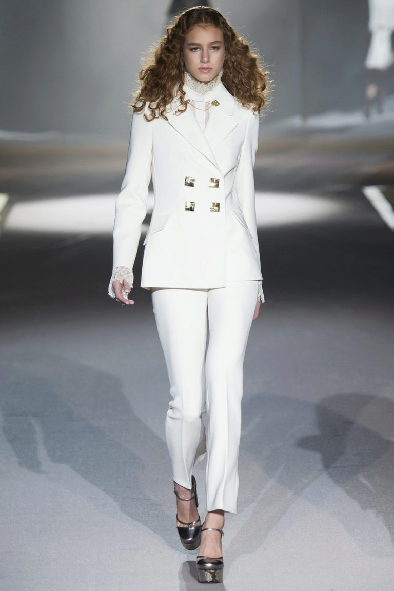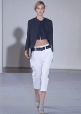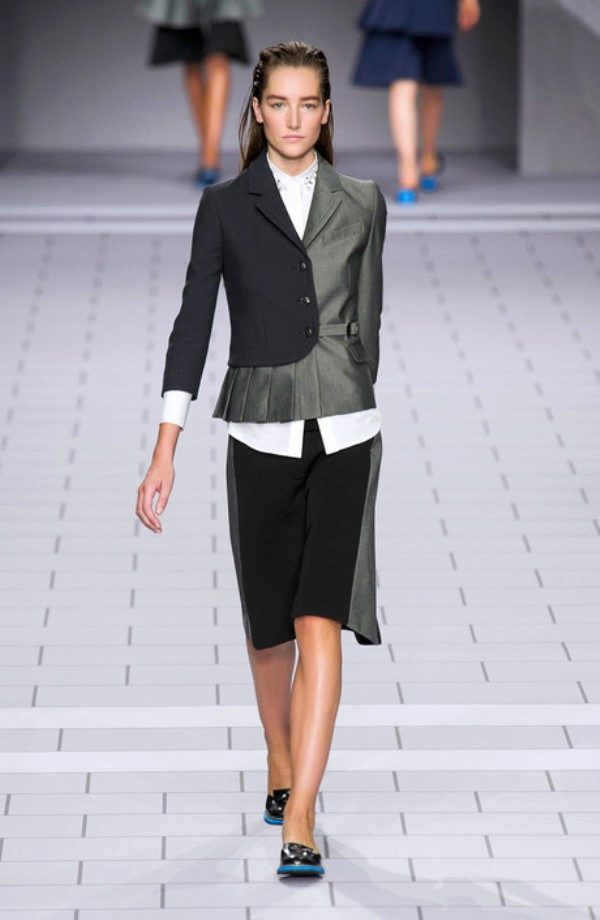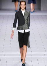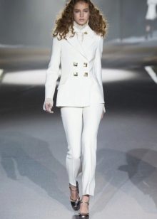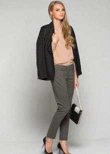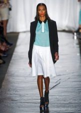 - Light gray jacket with white strict dress and black boats. A flirtatious detail complements the image: a black ribbon on the collar, serving as a tie.