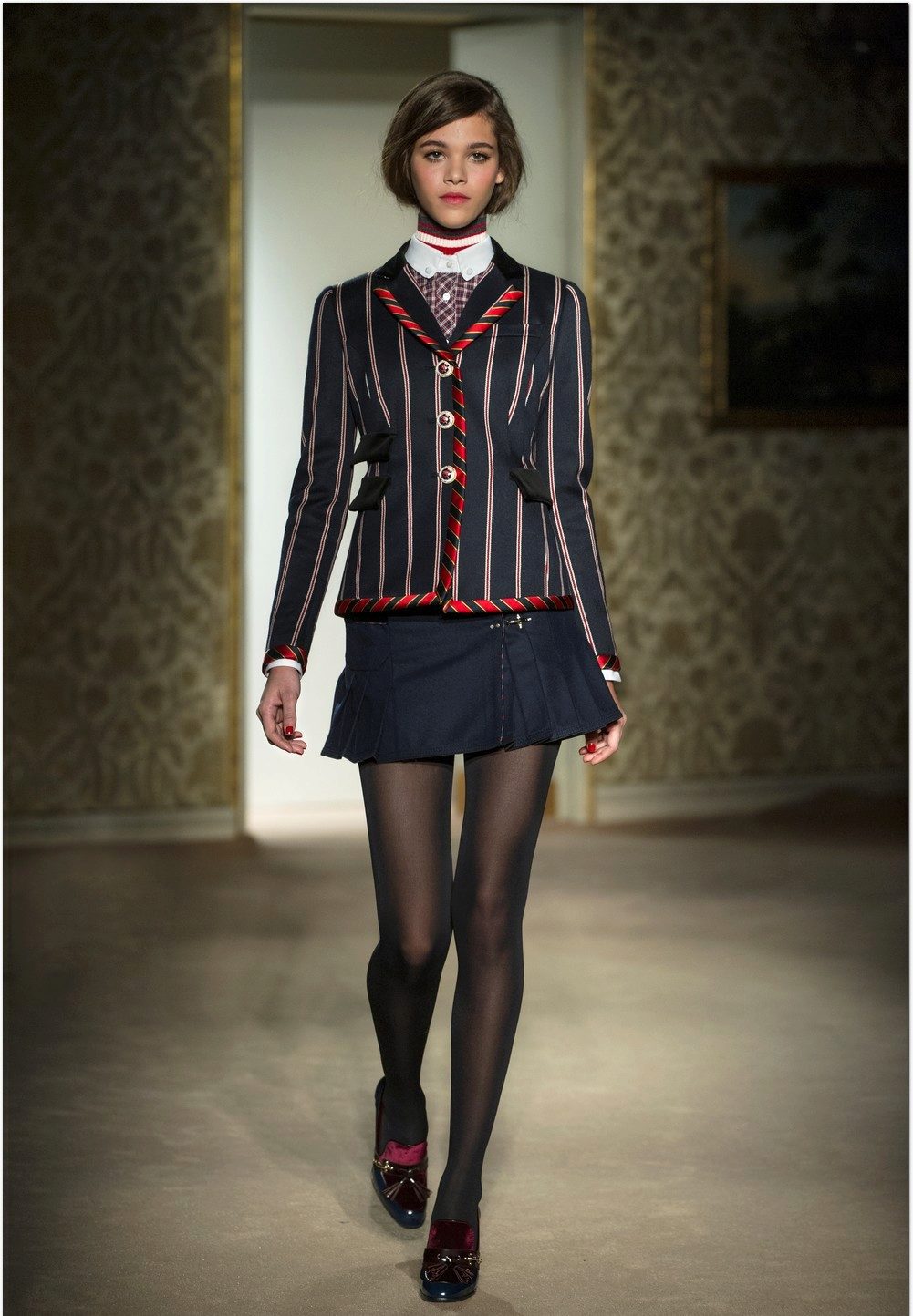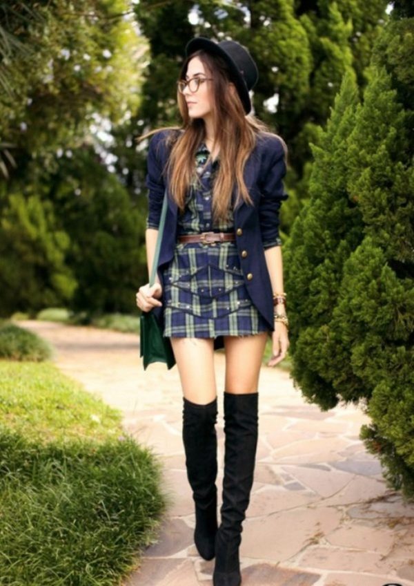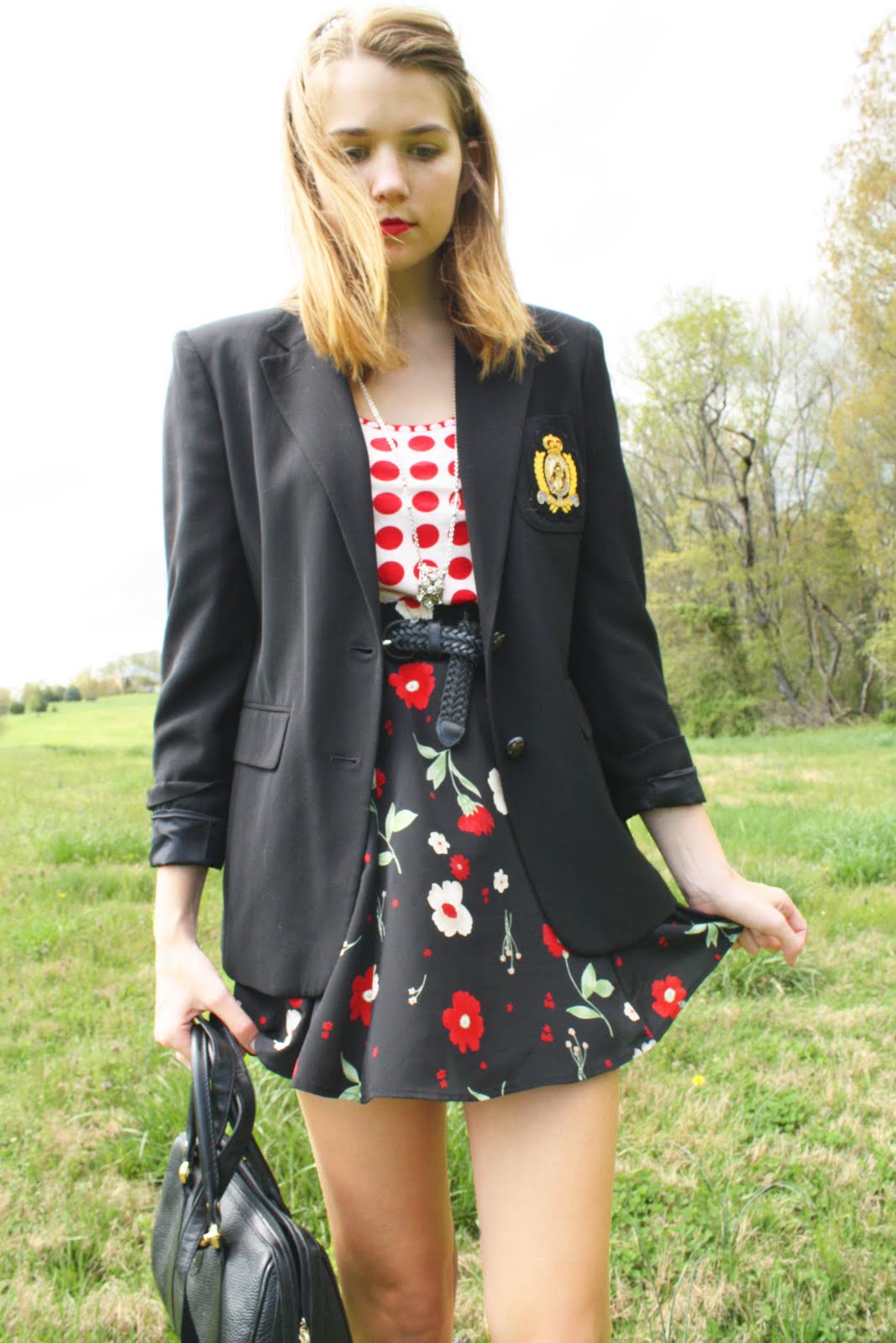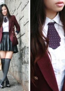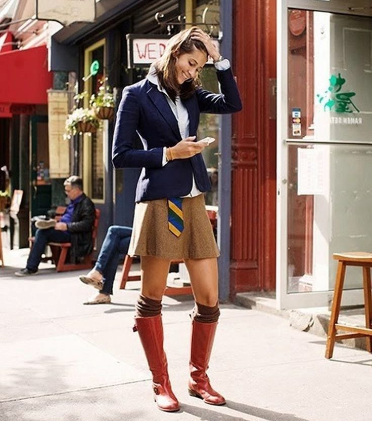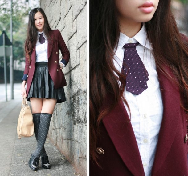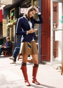 - Classic colors club jacket with a white shirt, "school" skirt, funny golf and coarse dark red boots.
