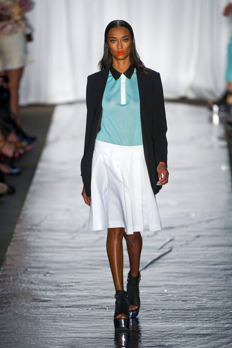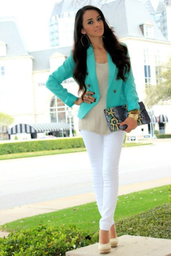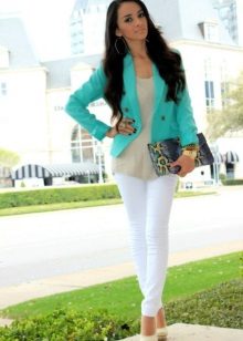 - Jacket bright mint shade with white narrow trousers, light top, shoes in tone and massive ornaments.