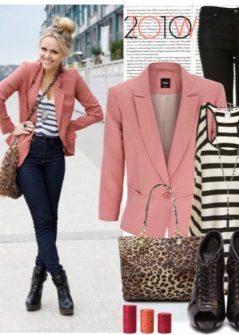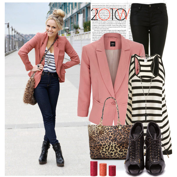 - Pink pink jacket with classic blue jeans, a striped nautical top, high lace-up shoes and a large leopard print bag.