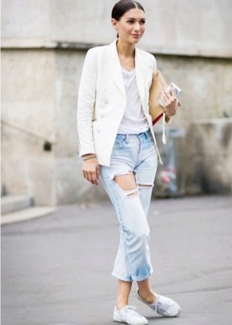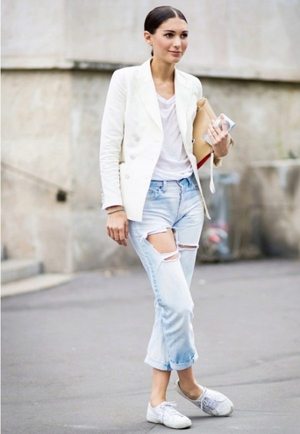 - A white blazer with ripped blue jeans, a simple T-shirt, and comfortable sneakers are also white.