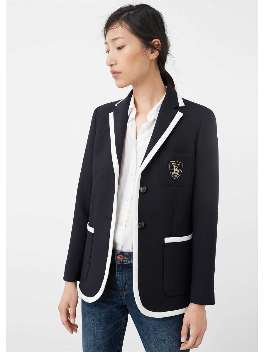 - The classic model from Mango: straight cut, traditional dark blue colors, contrasting white edging, a patch with the emblem of the club and patch pockets.