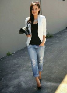 White jacket is the basic element of women's wardrobe. Any set of clothes, complemented by a snow-white jacket, looks very feminine and elegant.