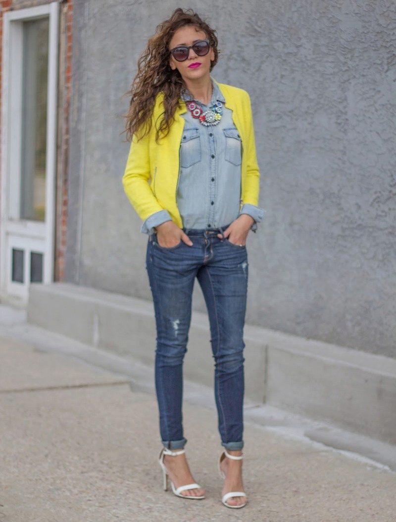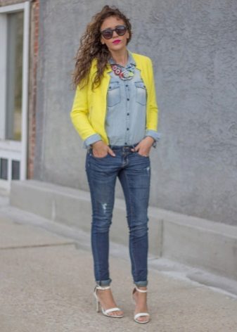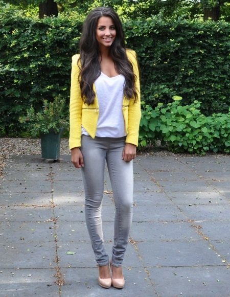 Romantic summer look: skin-tight gray jeans or leggings + a white top or tank top + a light jacket with a rich yellow color. Very simple and stylish outfit, which will complement the pastel-colored shoes.