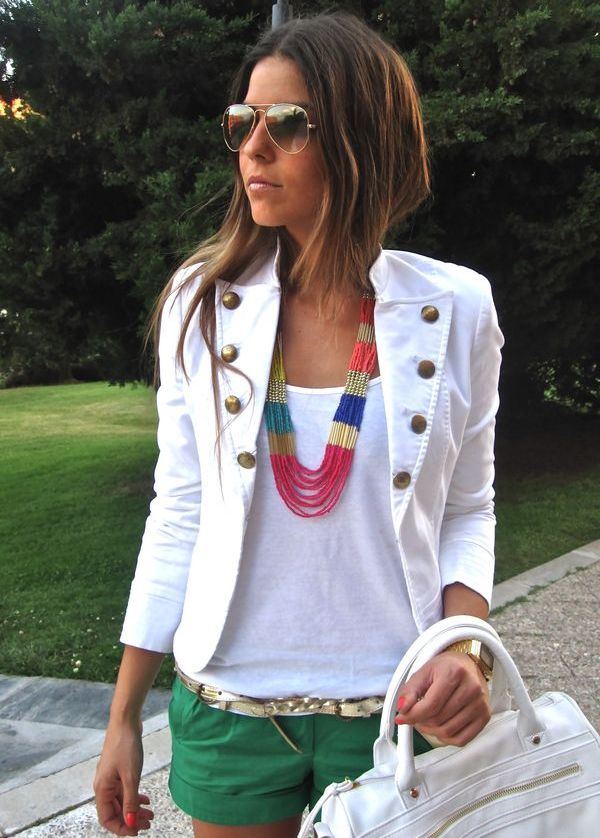 Spectacular outfit for a cool summer morning: white jacket with 3/4 sleeves + white jersey + mini shorts of emerald color. As accessories, multi-colored beads and a thin gold-plated belt are used.