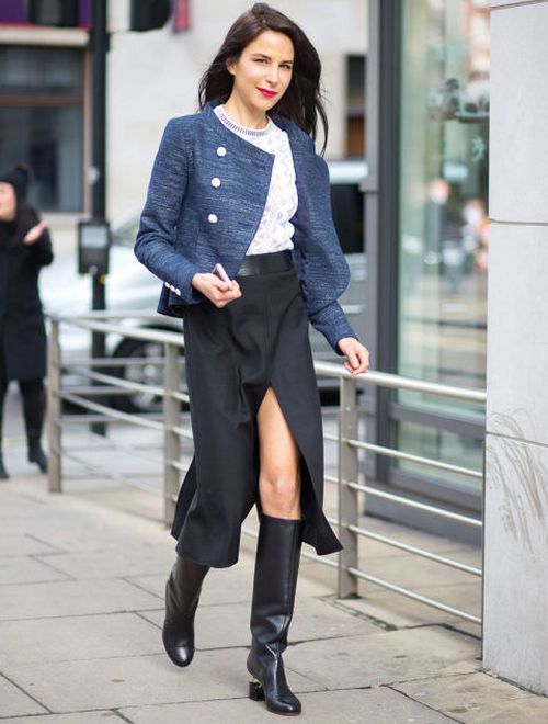 Skirt. Short jackets look very stylish with fluffy, flared knee-length skirts. It turns out very feminine set in a romantic style. A denim jacket will complement a leather mini skirt well. The jacket can be of any color, not necessarily the classic blue.