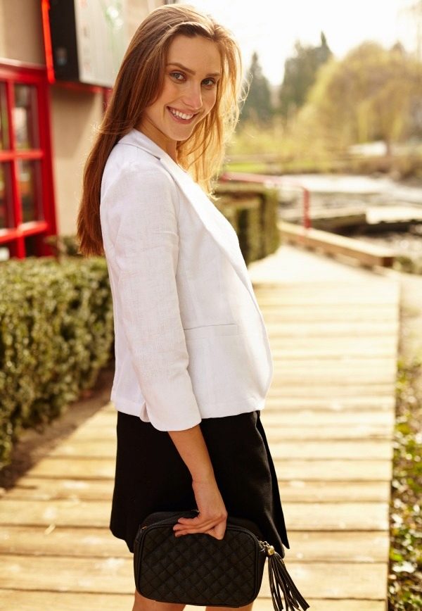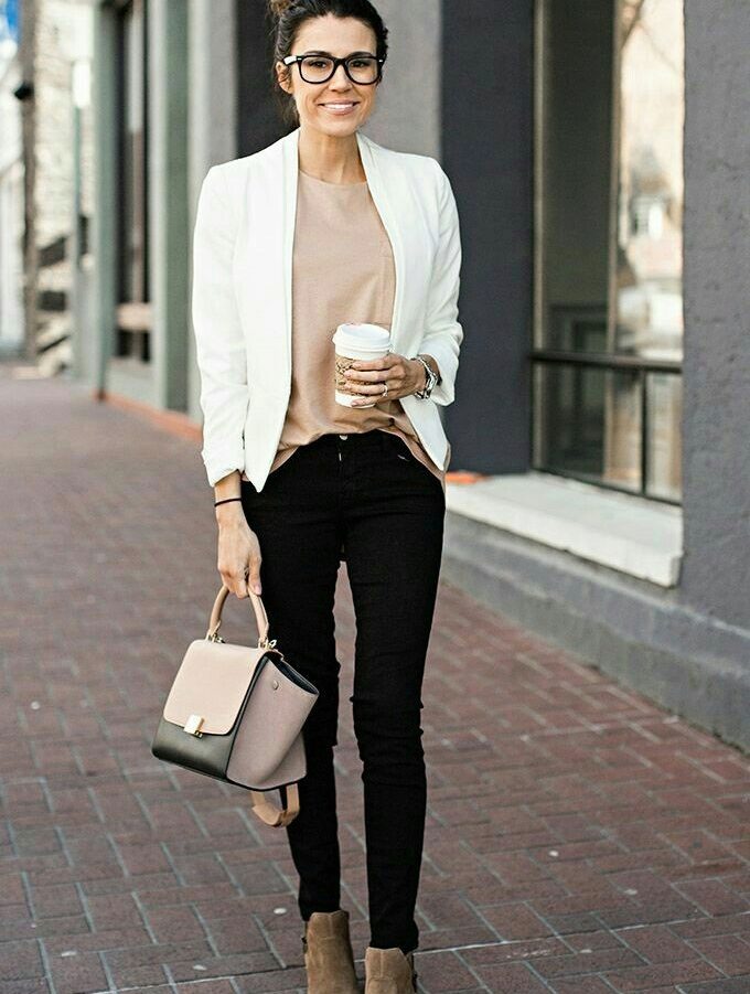 A white blazer can be part of a business suit, formal dress or casual look. Since the white color is already dominant in the image, the outfit does not need additional use of accessories or eye-catching decorations.