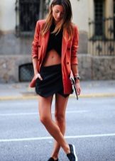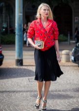 - Casual option. Dress in a classic red fitted jacket, black short pleated skirt, black lace top, black stockings and closed shoes for casual lovers. The silhouette can be complemented with a black puzet with a small pendant, a hat with a wide brim (red or black) and a small bag on a gold chain.