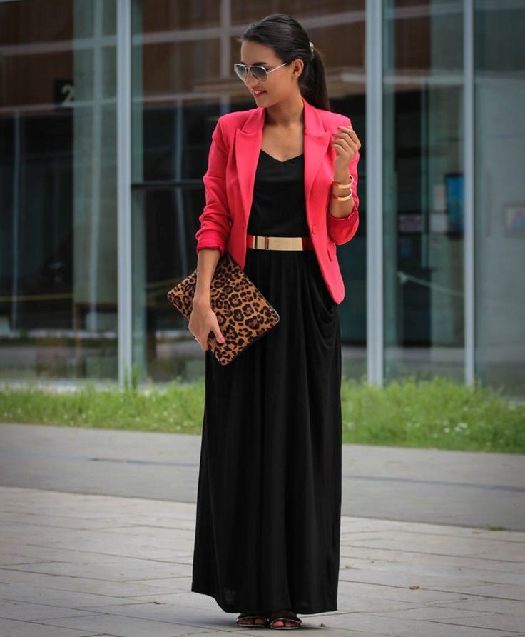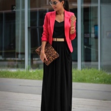 - For the evening. Excellent combination of red elongated velvet smoking jacket and black dress to the floor. The dress can be of different styles: with long sleeves, without sleeves, without straps, corset plan, flowing. Depending on the model, you can use the jacket as a cape.