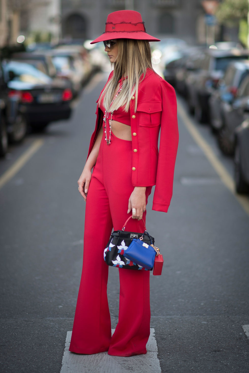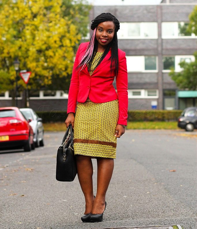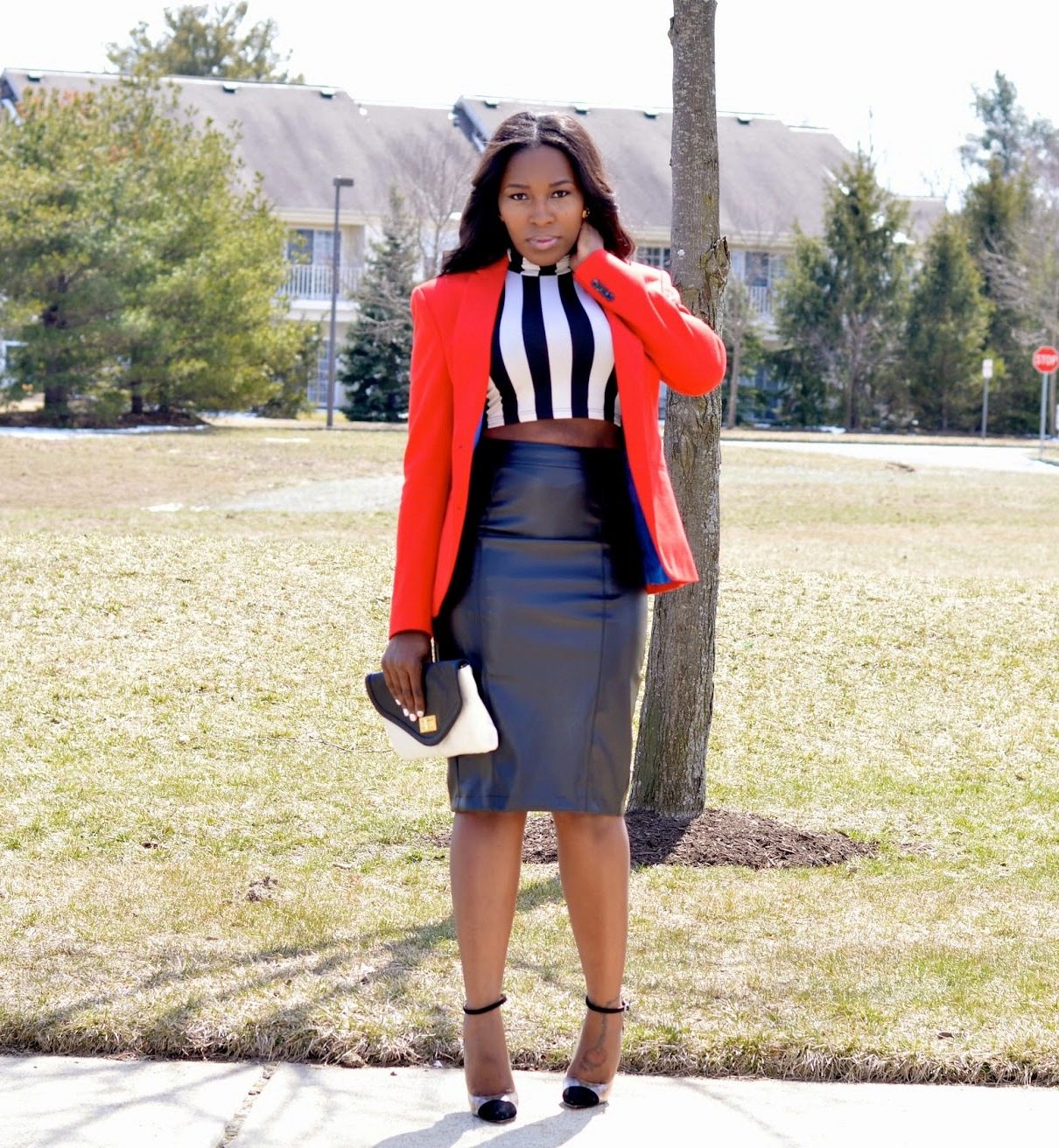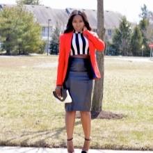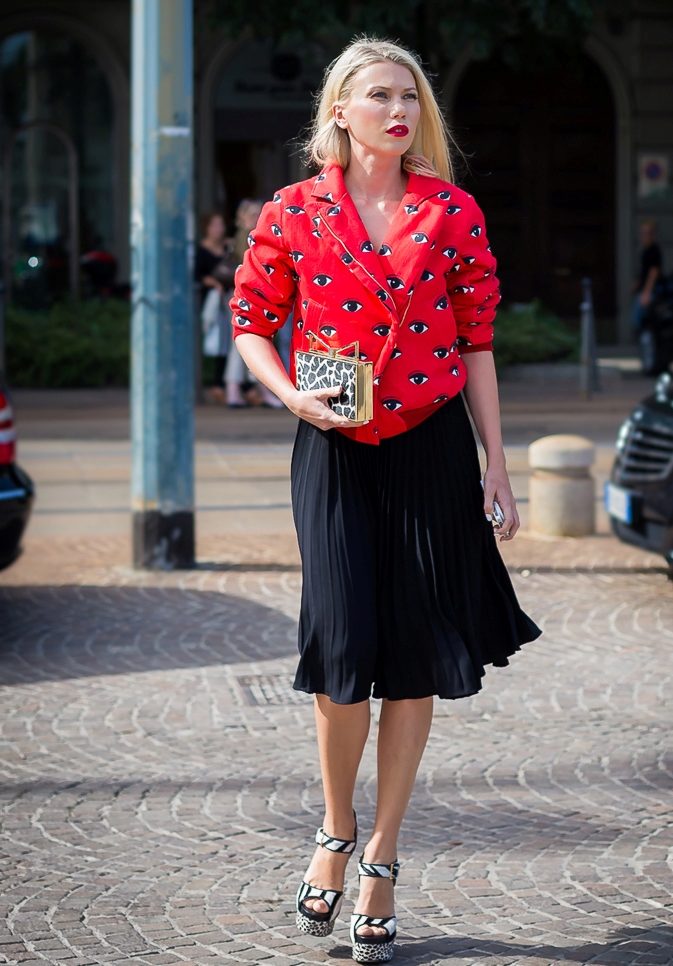 Modern elegance. A red cropped jacket is exquisite when combined with a white triangular neck blouse, a printed pencil skirt and a red bag. The brighter and more unusual the print, the more expressive and interesting your image. Heels are required!