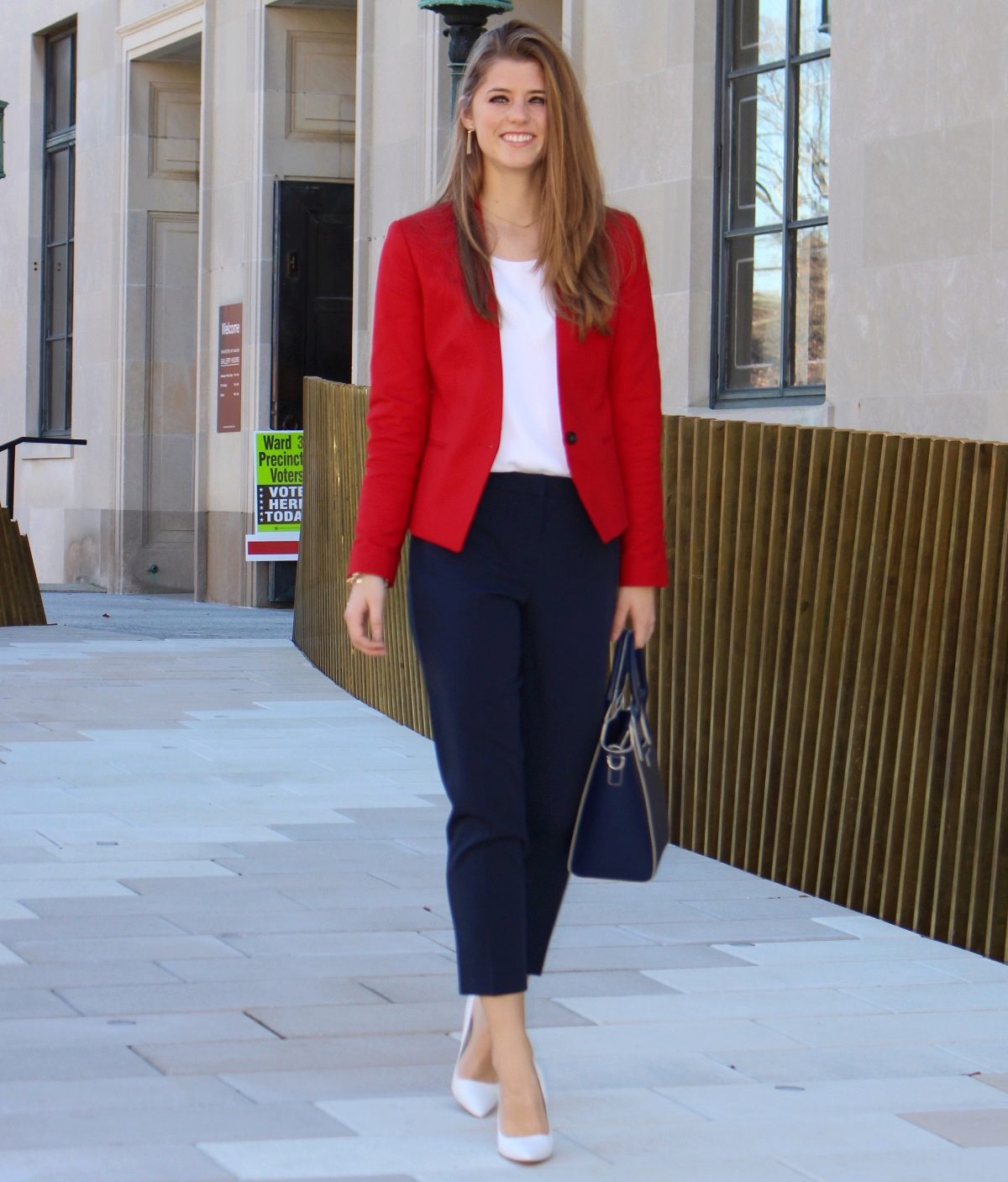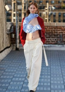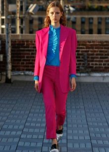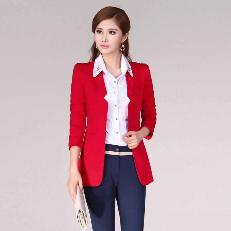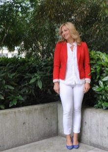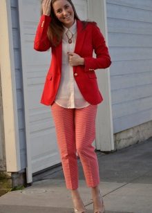 - For office. A double-breasted or classic red jacket, classic navy blue ankle pants with a high fit, white chiffon blouse are suitable for work. Minimum accessories. Ideal: stud earrings, a small pendant and a watch. Put black or blue heeled shoes on your feet.