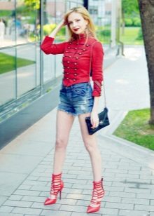 Casual chic. For a casual, stylish look, you will need: a red blazer with sleeves ¾, a T-shirt with an inscription or print, red shorts and pumps with heels. Complete the look with a clutch and stylish sunglasses.