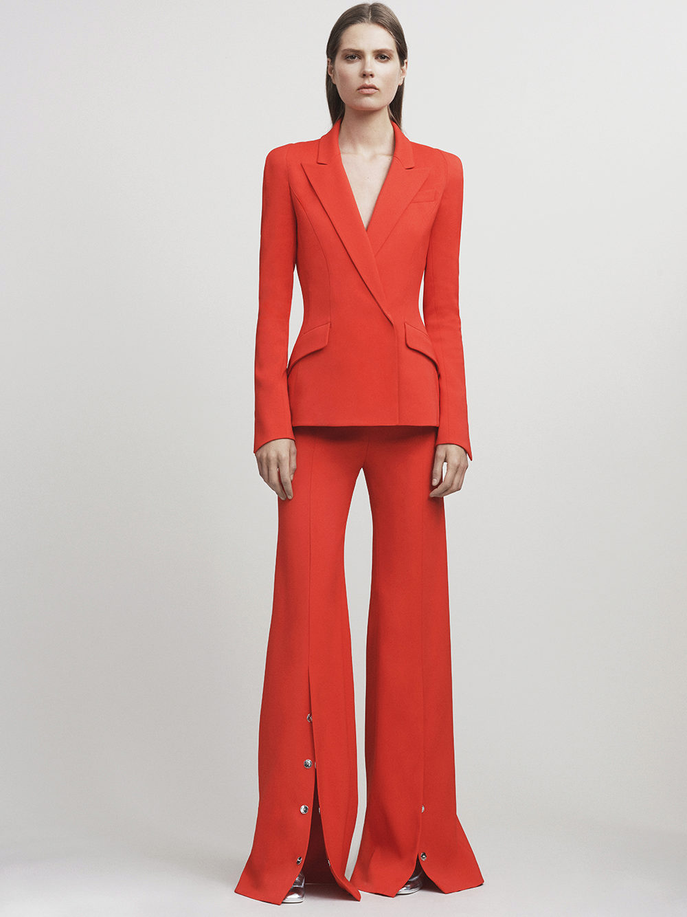 Double-breasted red jacket looks great in cold weather, and against the background of white snow - just a sight for sore eyes! Two rows of beautiful buttons - an additional element of decor, stylish and sophisticated.