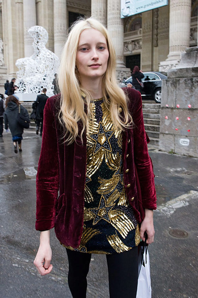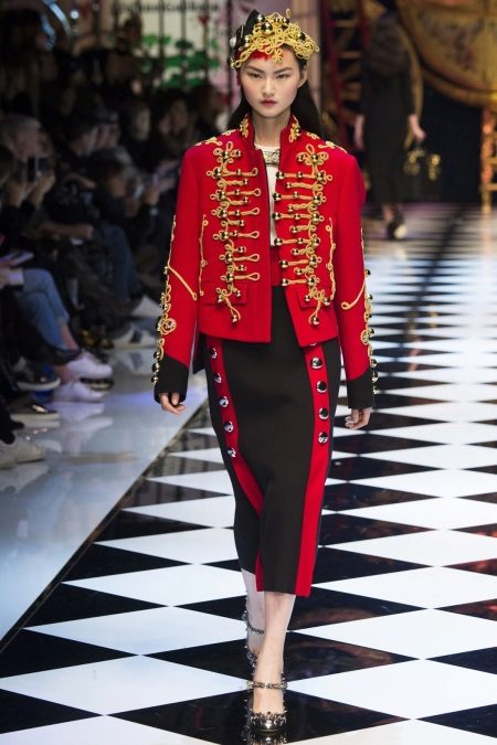 For a romantic Christmas look, choose a red double-breasted jacket with gold buttons, balls and a wide collar.