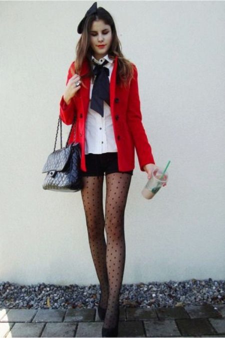 Preppy image For young fashionistas the most suitable option: black mini shorts, snow-white batch file with a black tie (bow tie or bow) and a red classic fitted jacket. Beautiful addition: patterned nylon tights, bezel and high heel shoes.