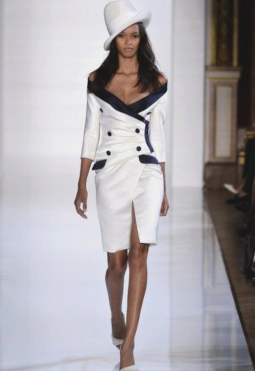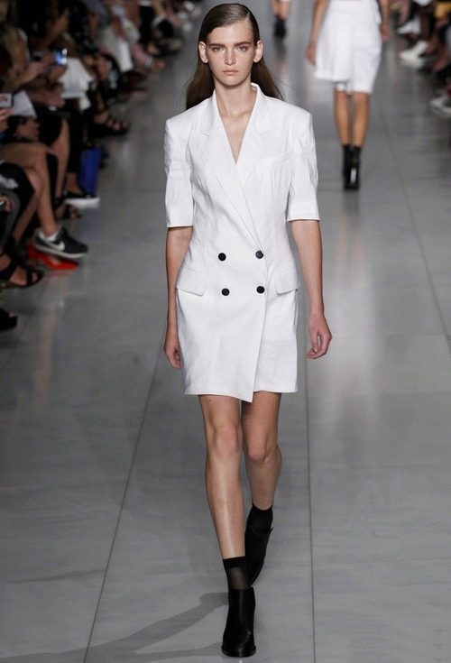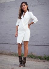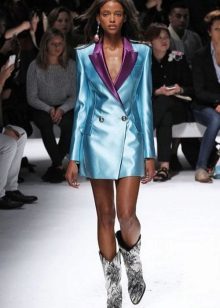 - Another image with a white dress jacket: here is a model of asymmetrical cut in combination with spectacular boots, stylized under the skin of a reptile.
