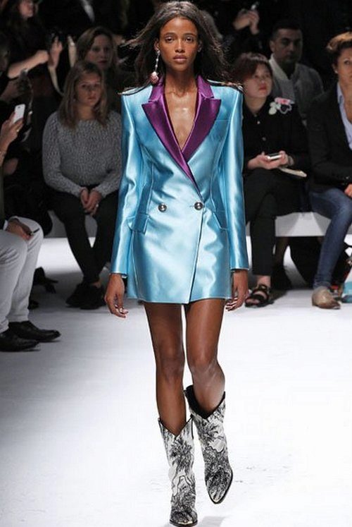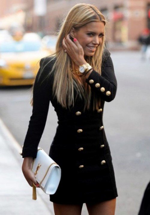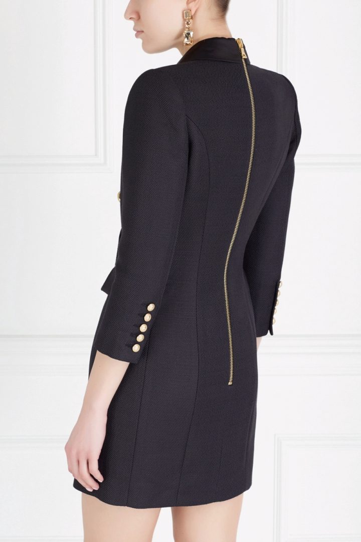 - A spectacular Balmain model: an expressive combination of black fabric and gold hardware, a long zipper on the back, a slim silhouette and a narrow sleeve.