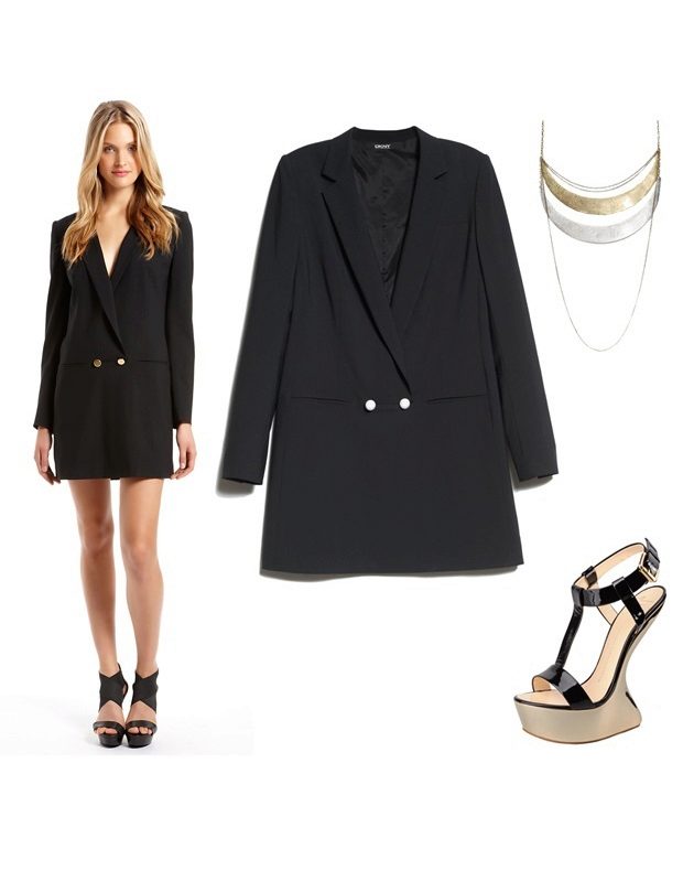 - Black dress jacket classic silhouette with massive sandals on thick straps and sleek necklace.