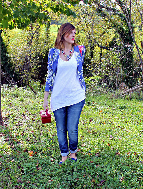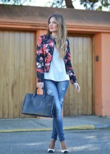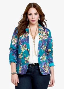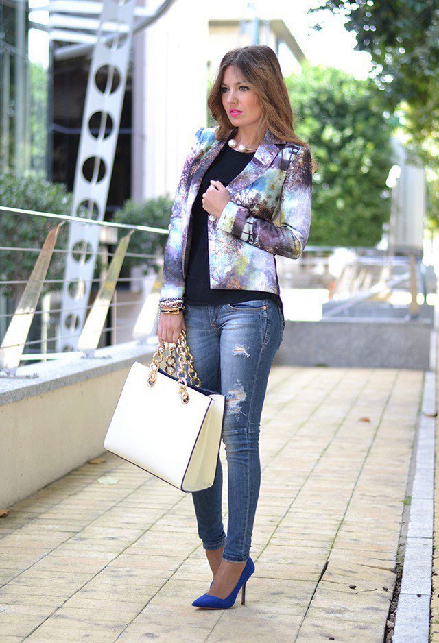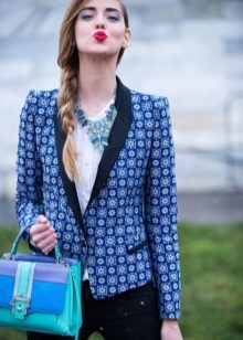 The most favorite print of a blue jacket is a floral one. Romantic, isn't it? In the spring and summer - appropriate and elegant. But do not forget about the emphasis on the jacket and restraint in the other elements of clothing.