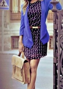 Romantic and elegant look will create a dress with a blue or purple floral print, combined with a blue jacket.