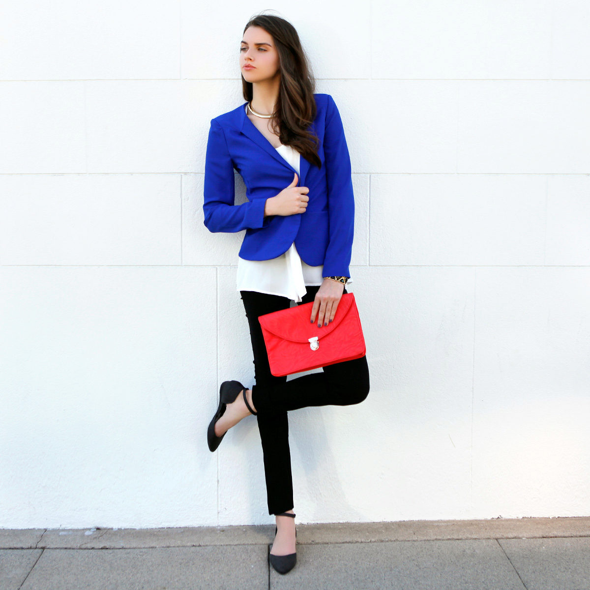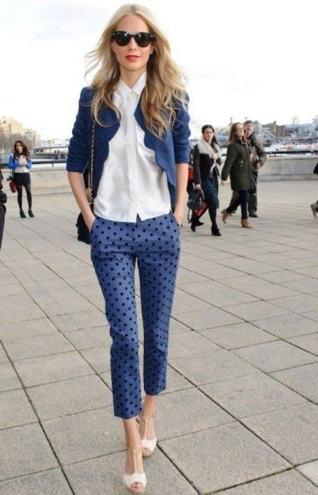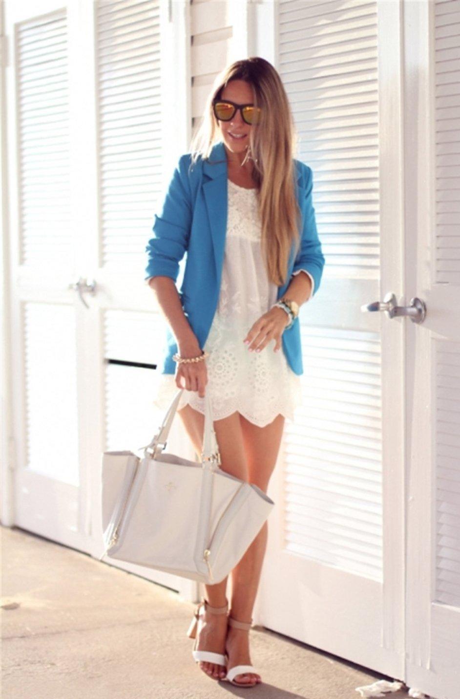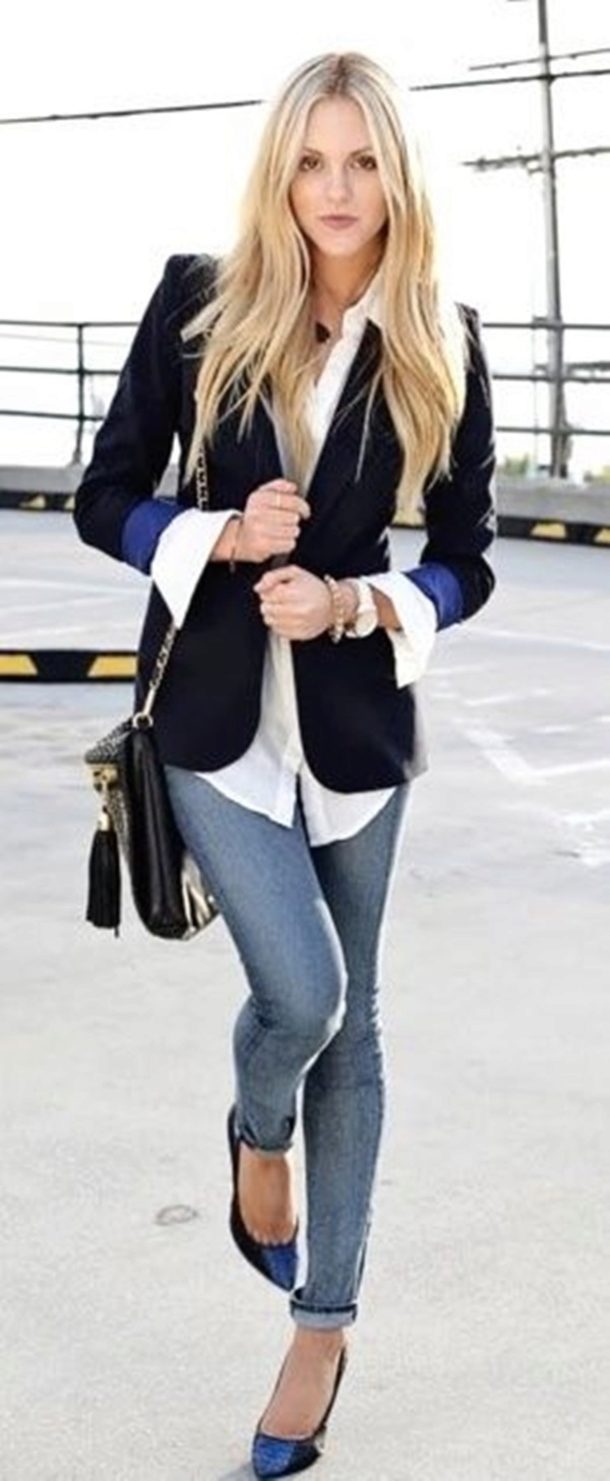 - A bright blue blazer with a romantic, light blouse is a perfect way to date or meet friends.