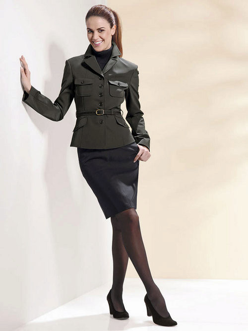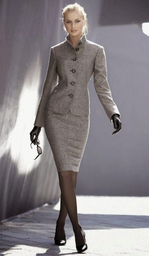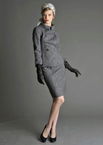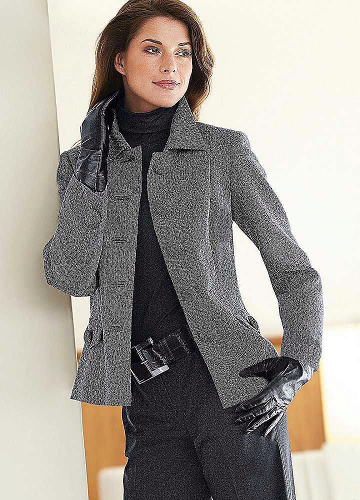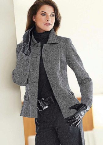 A thin sweater, a plain turtleneck, a checked shirt or an elegant blouse are often worn under the jacket. DYou can fill the image with elegant boats or high boots. A discreet decoration, a roomy oval or square bag, leather gloves, a scarf or an elegant hat will complete the look.