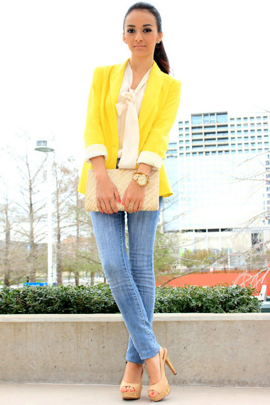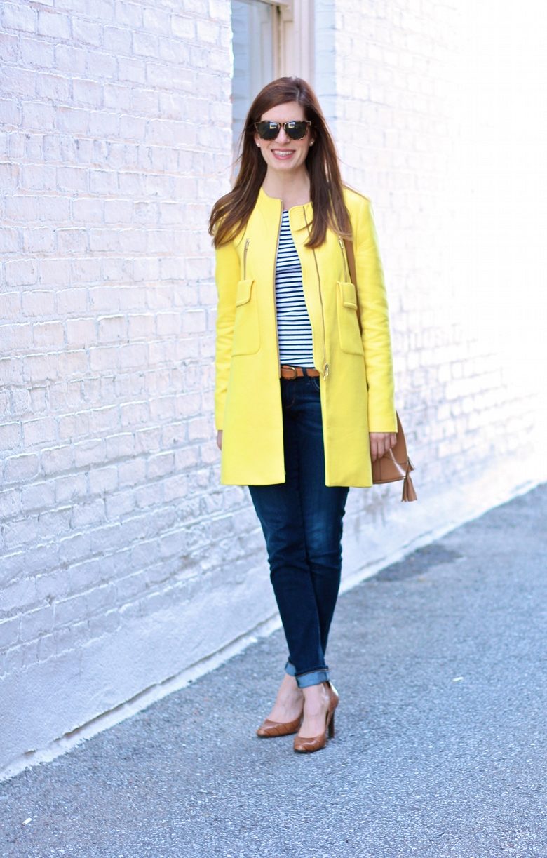 The yellow jacket goes well with blue - it can be jeans, a plaid shirt or a light top. With this combination, you should pay attention to the shades of things in harmony "by temperature" - a warm yellow color of the jacket should be combined with the same "warm" jeans.