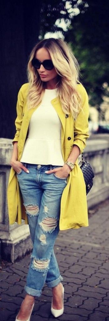 Light yellow The tone is very similar to sand color. It will suit girls of all color types, because they simply cannot give the skin a painful and unsightly look. Such a jacket will look very gentle and fresh. You can combine this shade with a variety of clothes, but best of all it will look with classic blue jeans with high heels.