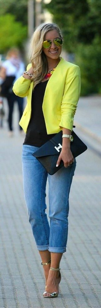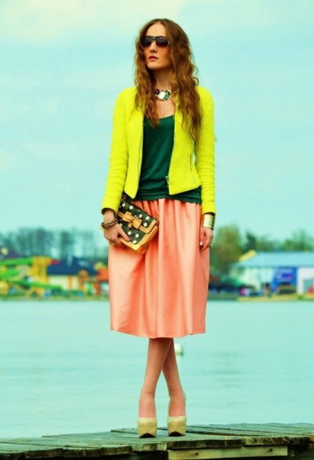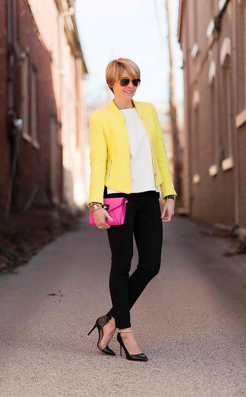 Bright jacket yellow neon most often sewn from thin fabrics that perfectly hold the shape.Such models assume wearing only in summer, because in a cold and transitional season such a tone will be completely inappropriate. A bright yellow jacket will accentuate your tan in a very profitable way and will help to create a unique and memorable image.
