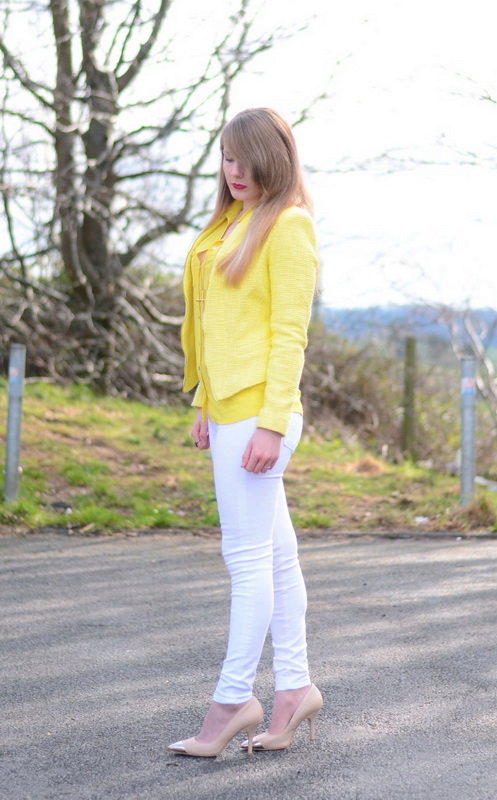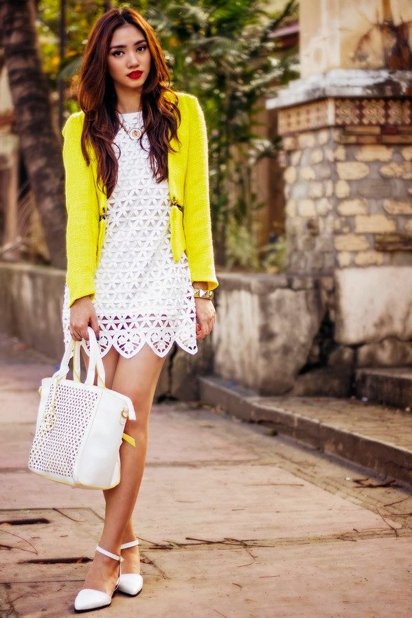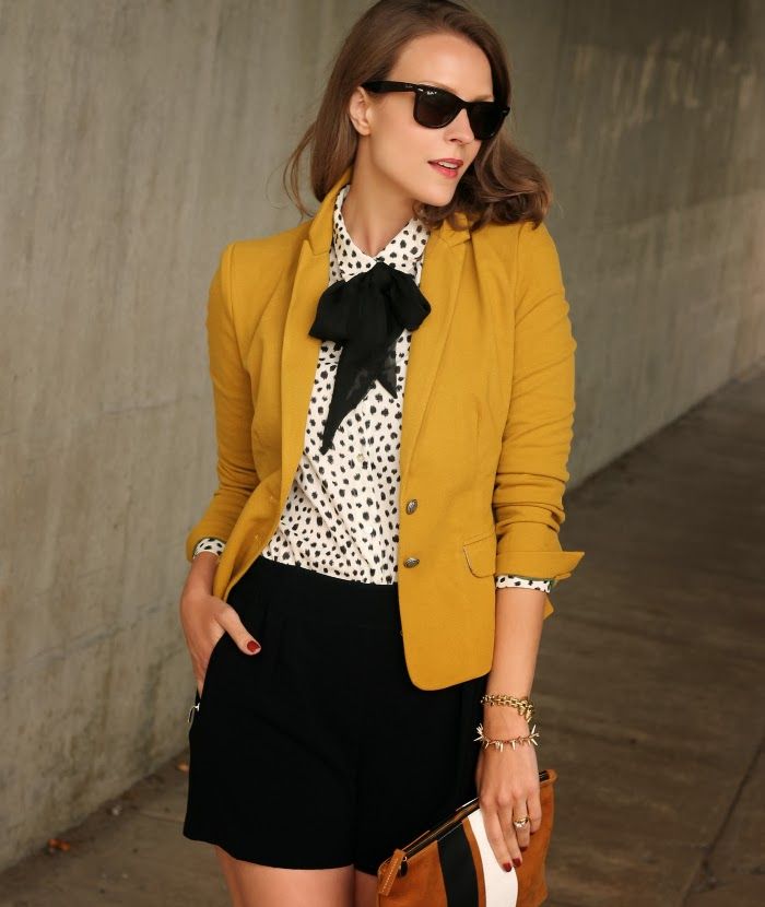 Looks great in business bows combination of yellow and white colors. A yellow jacket will be a bright accent of the image, and a white blouse will softly muffle its screaming tone.