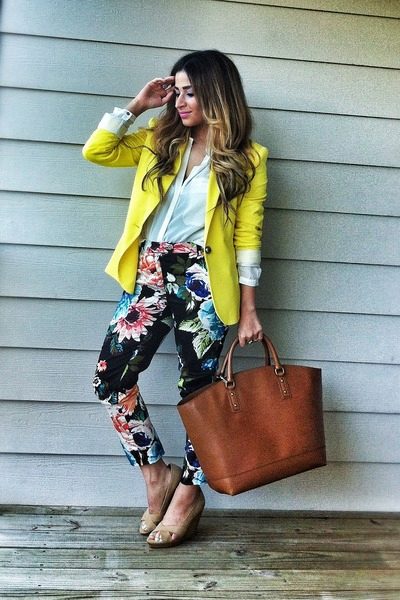 An excellent example of a business ensemble with a yellow jacket. White trousers and a gray jumper look very restrained and neutral, and a jacket in combination with a volume silver decoration slightly dilutes a strict look.
