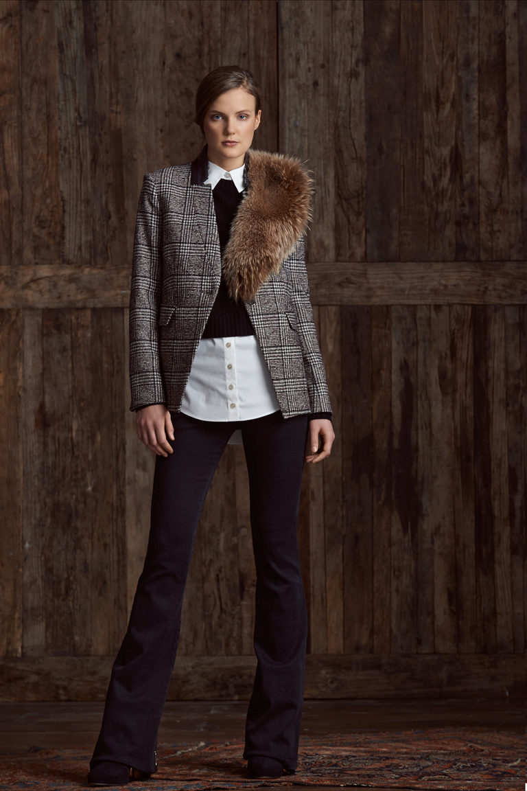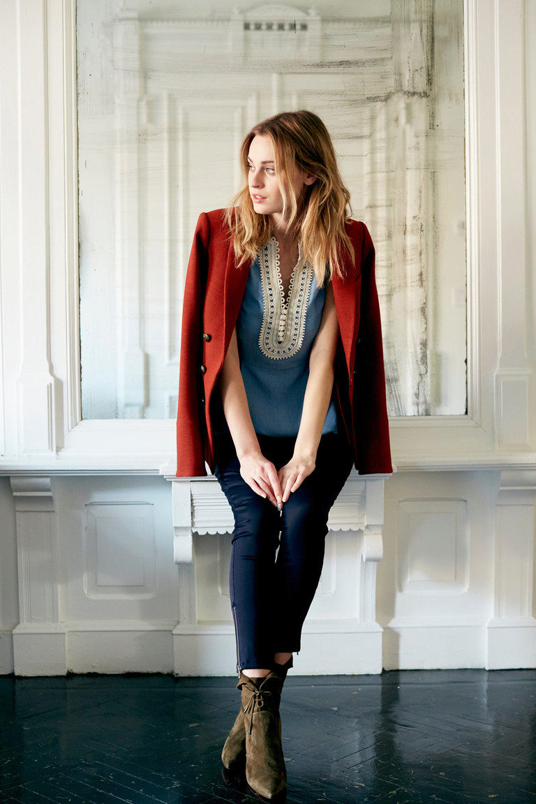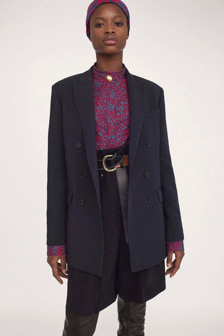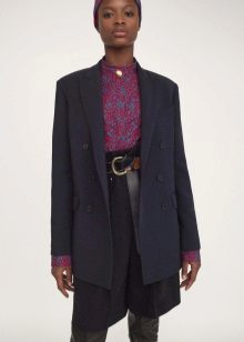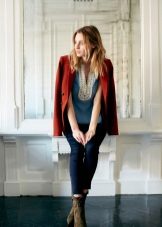 - If you are wearing a blouse, top or turtleneck, a shortened jacket of dark but noticeable colors - purple, chocolate, green tones - will match with it.