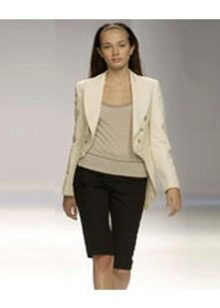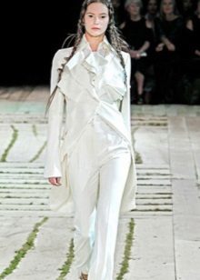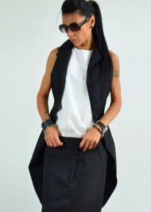 An interesting stylish model is a tailcoat-shaped vest with a beautiful turn-down collar. The white color of the product highlights the girl's tanned skin and goes to the color of her hair. The ensemble harmoniously complements the long black T-shirt and narrow gray pants. An interesting design solution - the lining of a waistcoat-tail coat is decorated with a thin vertical stripe of inconspicuous color.