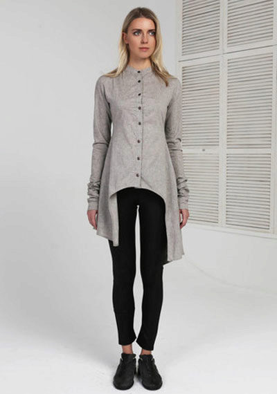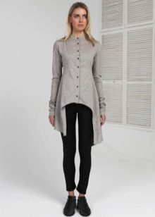 Incredibly feminine and sexy tail dress blouse made in gray. The highlight of the model are black lace decor on the back. Such openwork inserts adorn the shoulders (imitation shoulder straps) and cuffs of the shortened sleeves. The exquisite dress coat, which, thanks to its cut, emphasizes the slim waist of the girl, perfectly complements the black miniskirt with ruffles.
