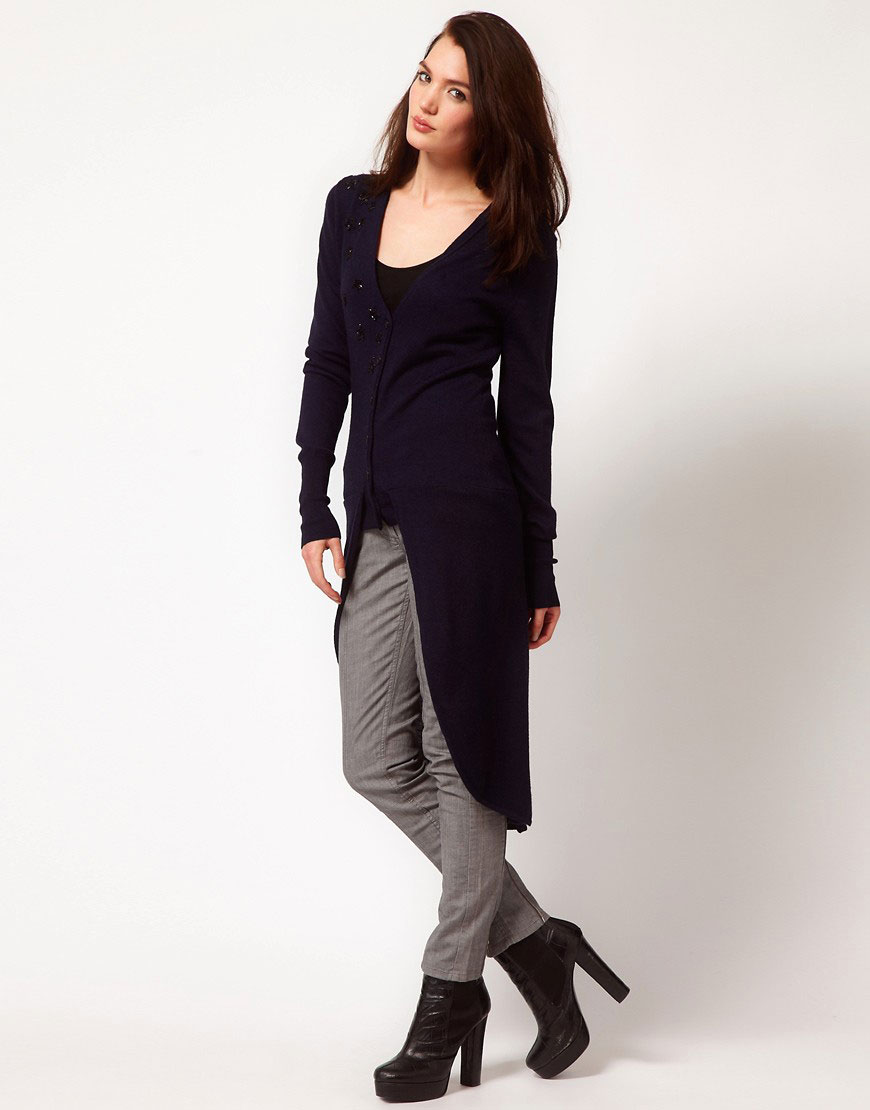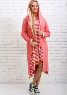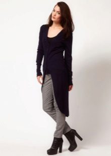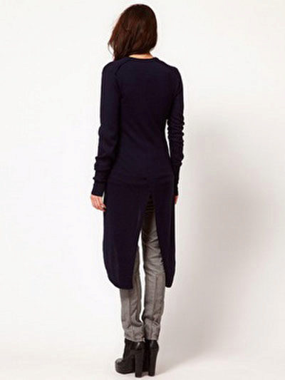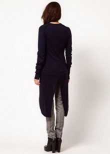 An interesting piece of clothing - a cardigan in the form of a dress coat, which is usually worn on jeans and a long shirt. Such a model, made of thin material, visually slims the silhouette. A cardigan may have a collar, cuts and assemblies at the back.