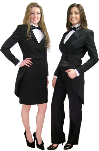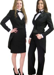 If the traditional male models are made in black or dark blue, then for the female tailcoats the color range is much richer. The snow-white version looks elegant. In addition, you will not see anyone in pink, green, blue ladies' tails.