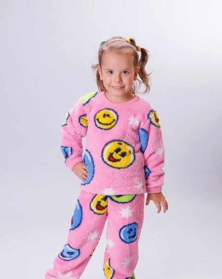 Bright, positive pajamas for the girl. The top and bottom are designed in the same color scheme, smiling faces and stars will certainly please young ladies. Comfortable, not constraining movements in a dream, pink pajamas are pleasant to the touch. In such clothes a young princess can spend the whole day!