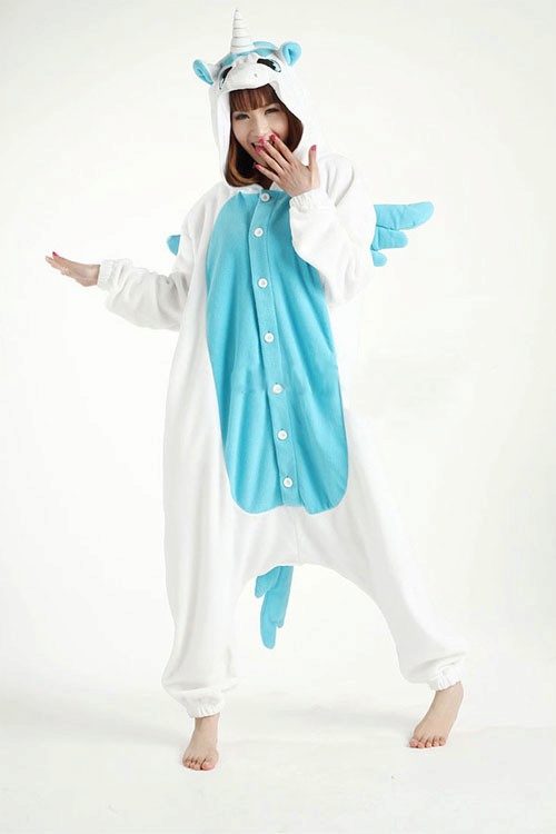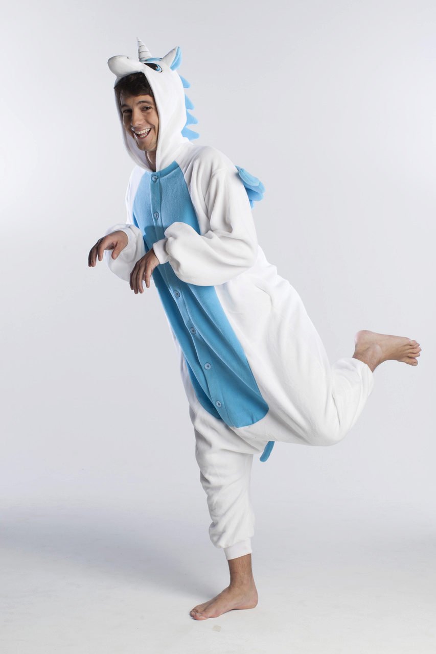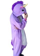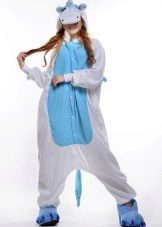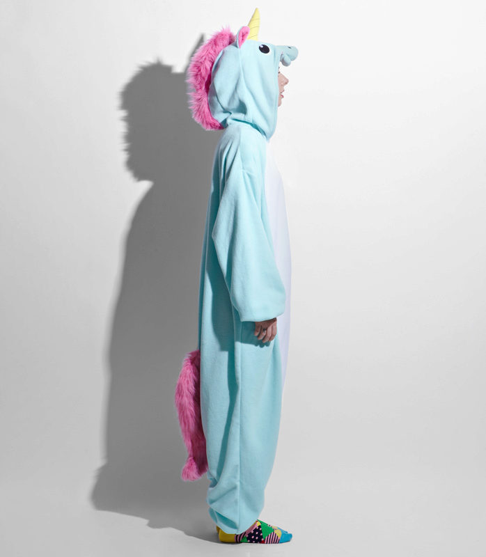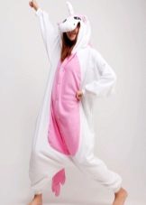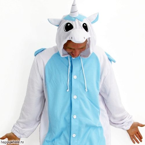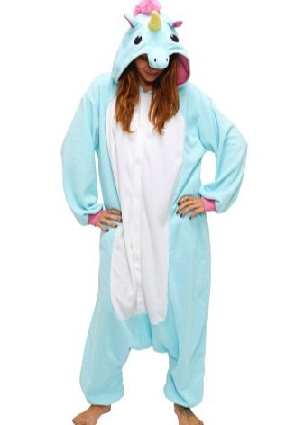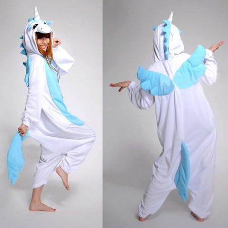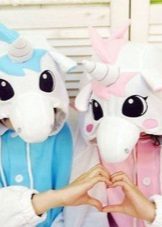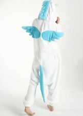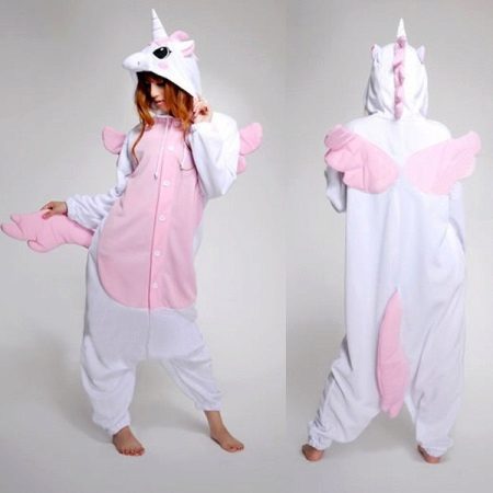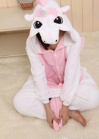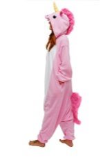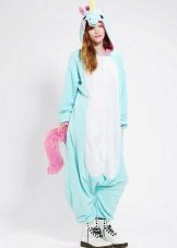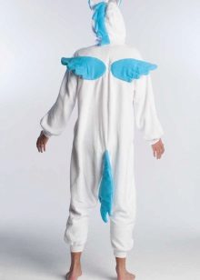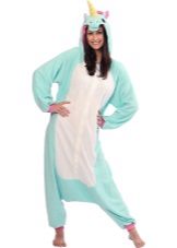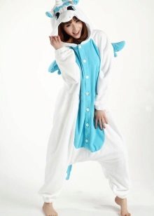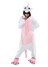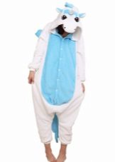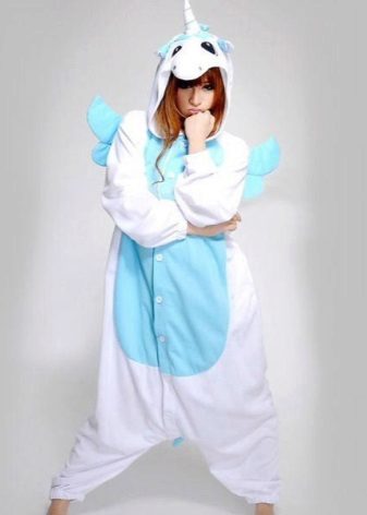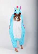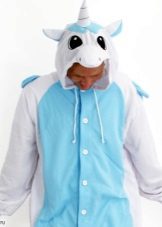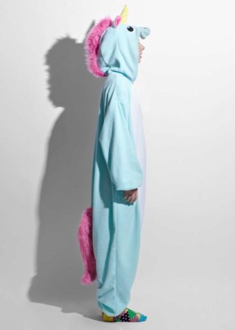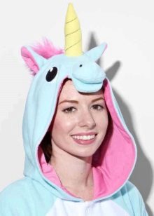 Funny pajama unicorn is a costume of a mythological animal. It can be just pants and a blouse, decorated with the image of a fairytale horse, but also a jumpsuit with three-dimensional details: a round belly, big ears, a mane, blue wings, a huge horn on the hood.