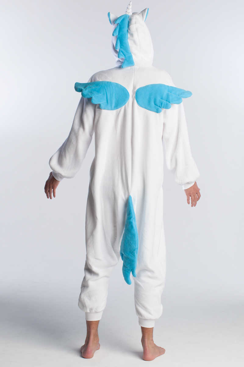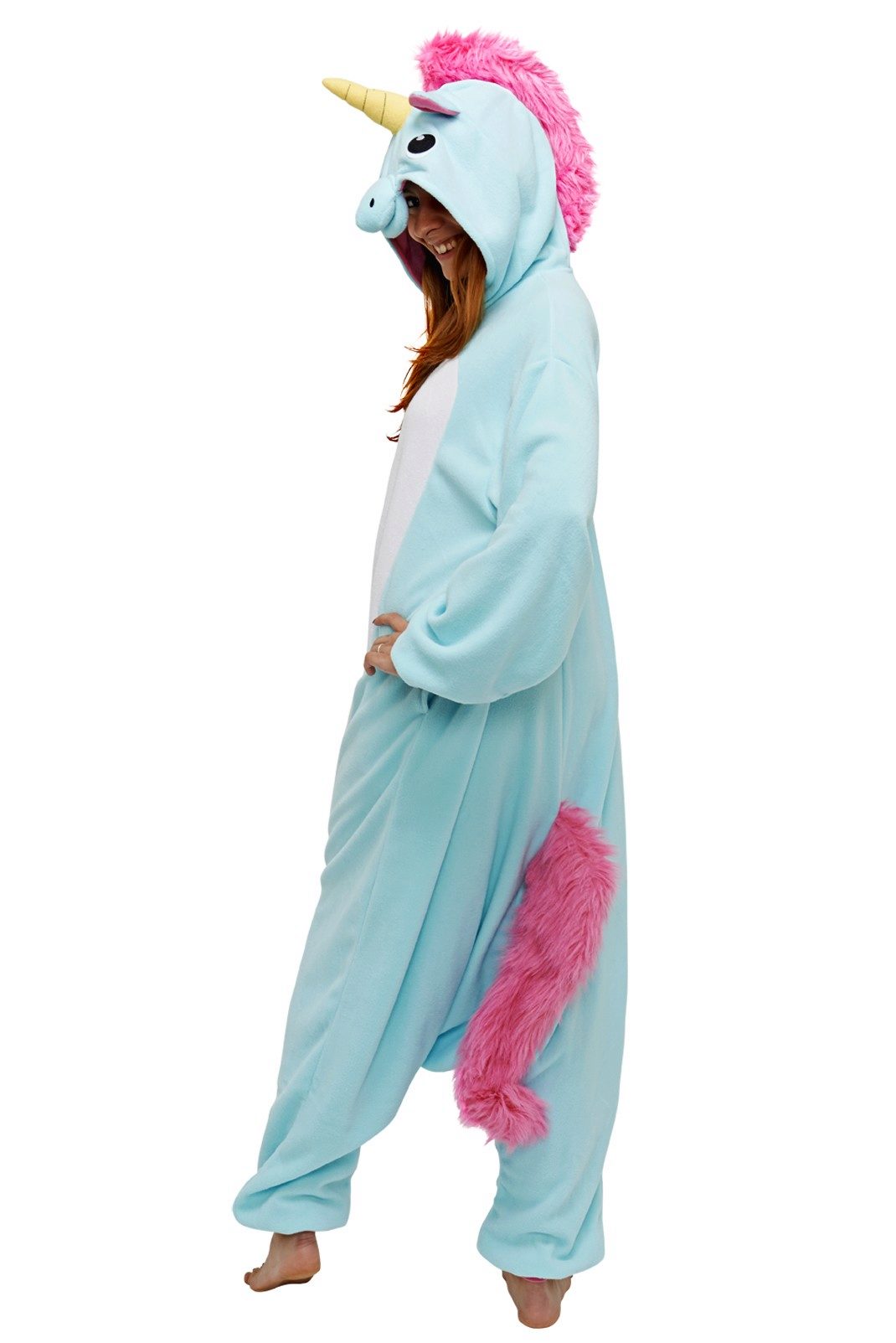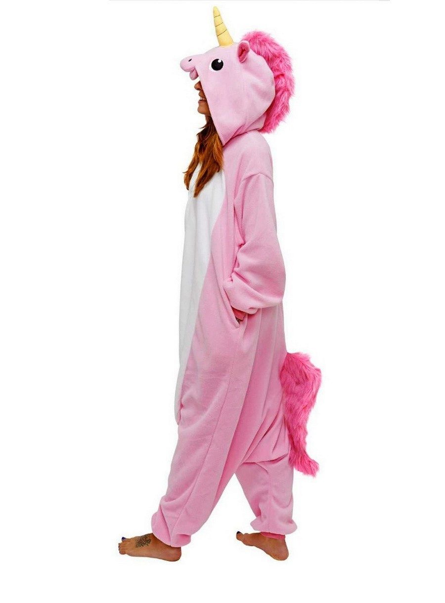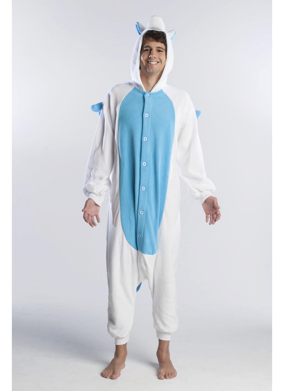 Funny pajama unicorn is a costume of a mythological animal. It can be just pants and a blouse, decorated with the image of a fairytale horse, but also a jumpsuit with three-dimensional details: a round belly, big ears, a mane, blue wings, a huge horn on the hood.